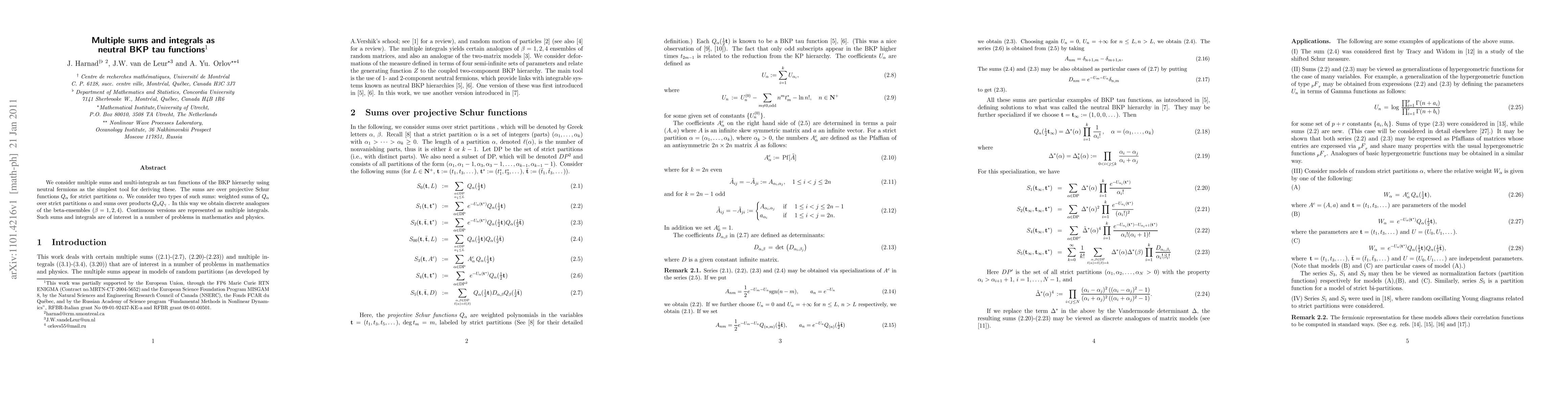 We consider multiple sums and multi-integrals as tau functions of the BKP hierarchy using neutral fermions as the simplest tool for deriving these. The sums are over projective Schur functions $Q_\alpha$ for strict partitions $\alpha$. We consider two types of such sums: weighted sums of $Q_\alpha$ over strict partitions $\alpha$ and sums over products $Q_\alpha Q_\gamma$. In this way we obtain discrete analogues of the beta-ensembles ($\beta=1,2,4$). Continuous versions are represented as multiple integrals. Such sums and integrals are of interest in a number of problems in mathematics and physics.