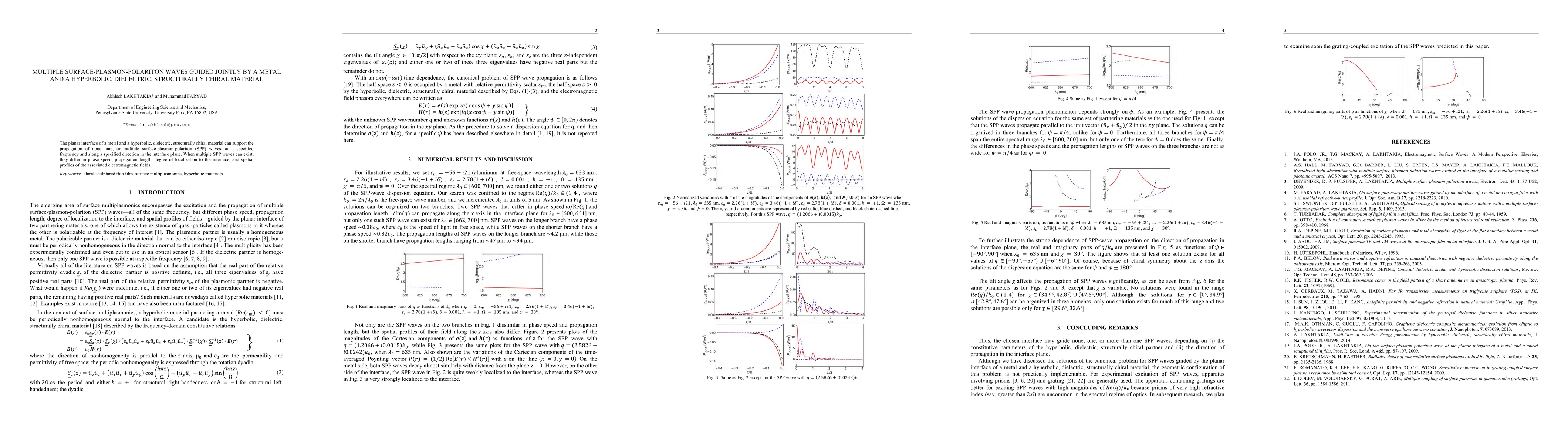 The planar interface of a metal and a hyperbolic, dielectric, structurally chiral material can support the propagation of none, one, or multiple surface-plasmon-polariton (SPP) waves, at a specified frequency and along a specified direction in the interface plane. When multiple SPP waves can exist, they differ in phase speed, propagation length, degree of localization to the interface, and spatial profiles of the associated electromagnetic fields.