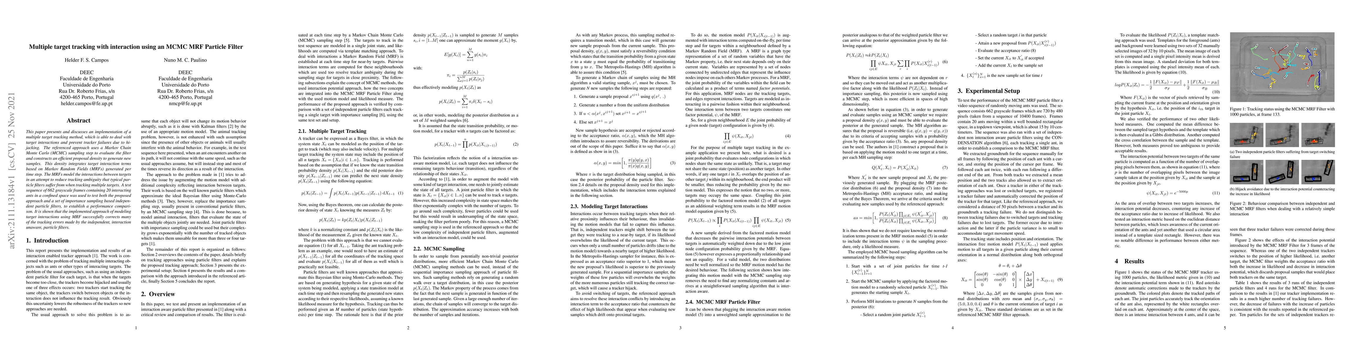 This paper proposes an MCMC MRF Particle Filter for multiple target tracking that incorporates interaction modeling via Markov Random Fields to reduce tracking ambiguity. The method was tested on a sequence of 20 interacting ants, showing improved performance over independent particle filters by better handling target interactions.