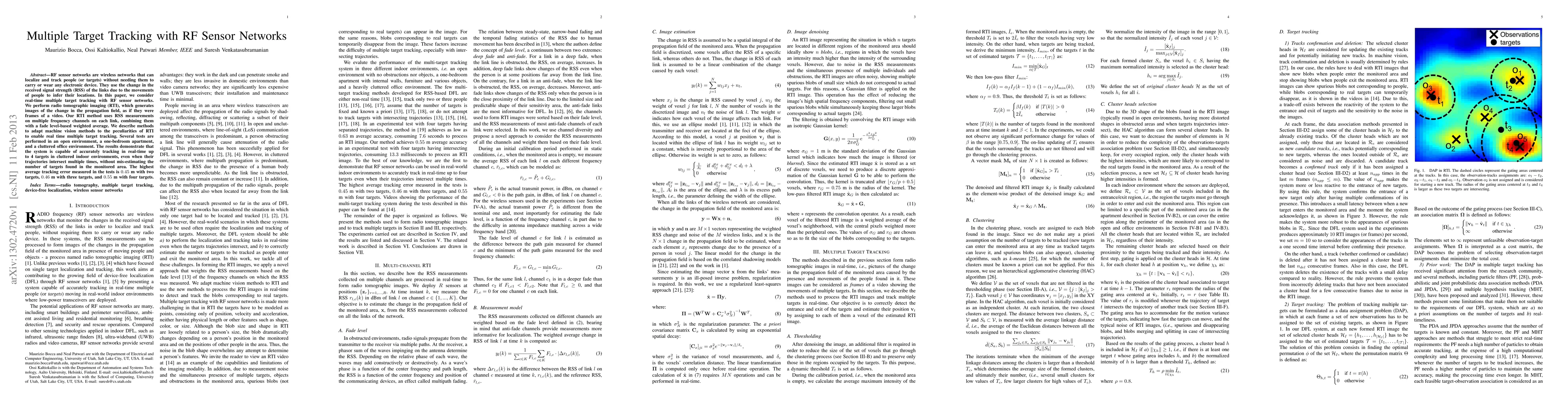 This paper explores real-time multiple target tracking using RF sensor networks, employing radio tomographic imaging (RTI) to generate dynamic images of propagation fields. The RTI method combines RSS measurements across multiple frequency channels, adapting machine vision techniques for accurate real-time tracking in cluttered indoor environments, achieving an average tracking error of up to 0.55 m for four targets.
