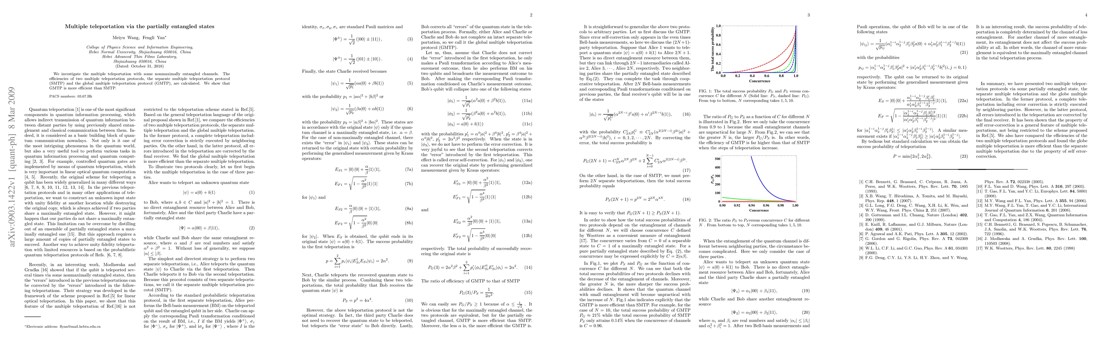 This paper examines multiple quantum teleportation using partially entangled states, comparing the efficiencies of two protocols: the separate multiple teleportation protocol (SMTP) and the global multiple teleportation protocol (GMTP). It concludes that GMTP is more efficient than SMTP.