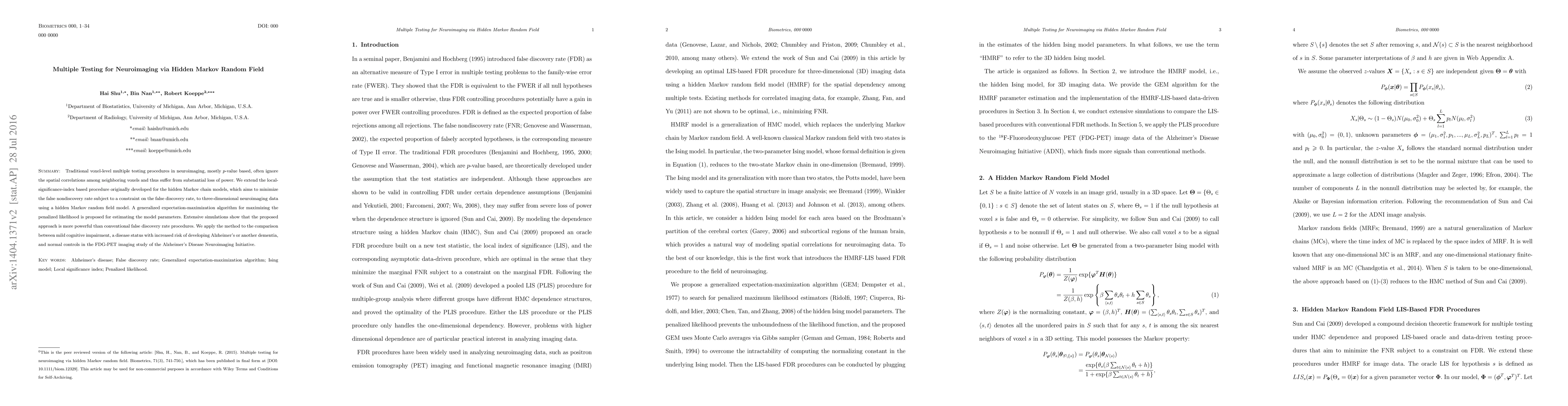 This paper proposes a new method for multiple testing in neuroimaging that utilizes a hidden Markov random field model to account for spatial correlations among voxels, enhancing power compared to traditional $p$-value-based methods. The method is applied to FDG-PET imaging data to compare mild cognitive impairment and normal controls, demonstrating improved detection capabilities.