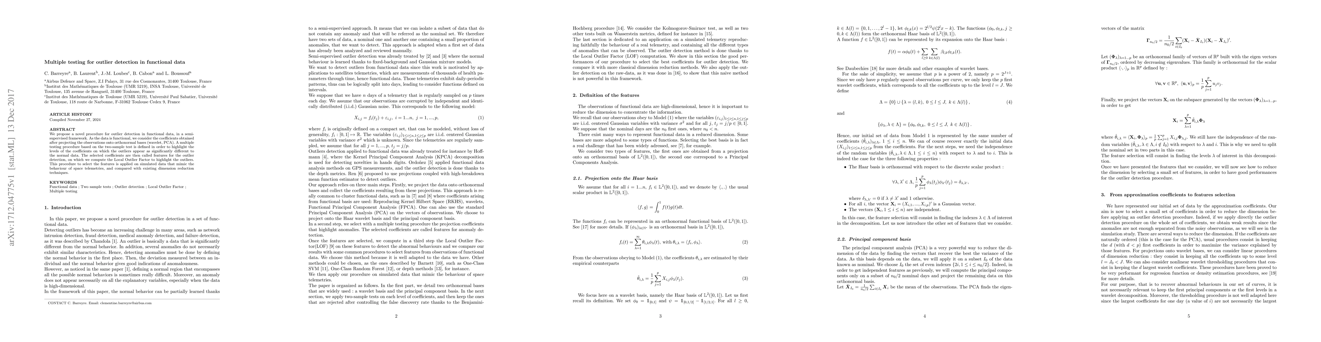 This paper introduces a new semi-supervised method for outlier detection in functional data using multiple testing to identify significant differences in projection coefficients. The Local Outlier Factor is applied to detected features to highlight outliers, and the method is evaluated against existing techniques on simulated telemetry data.
