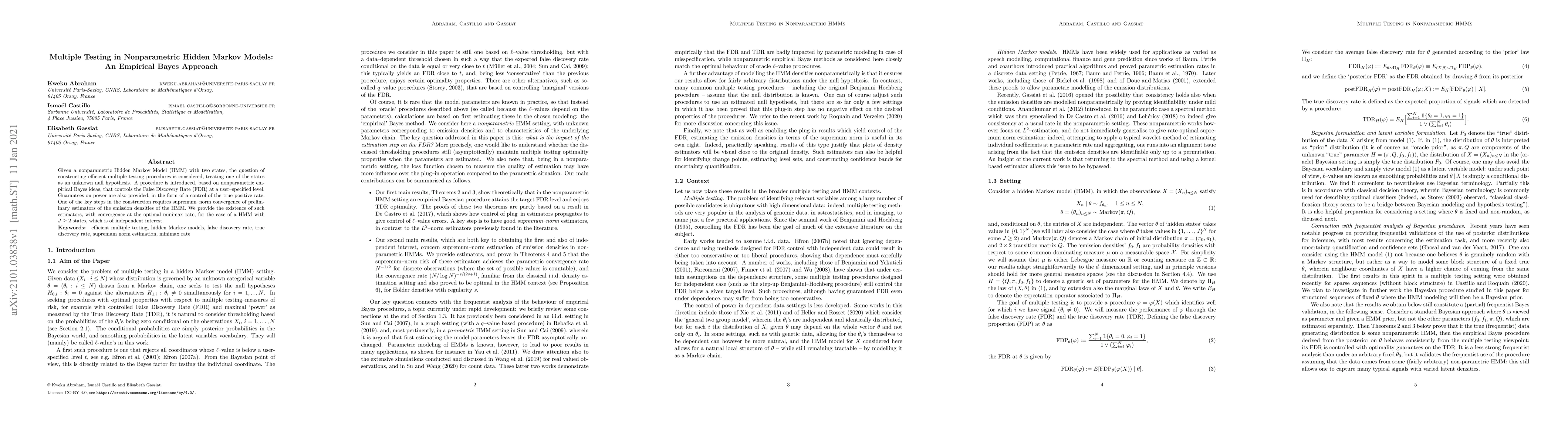 This paper introduces an empirical Bayes approach to construct efficient multiple testing procedures for nonparametric Hidden Markov Models (HMM) with two states, controlling the False Discovery Rate (FDR) at a specified level. It also provides guarantees on power through the control of the true positive rate, leveraging supremum-norm convergence of preliminary estimators for emission densities.
