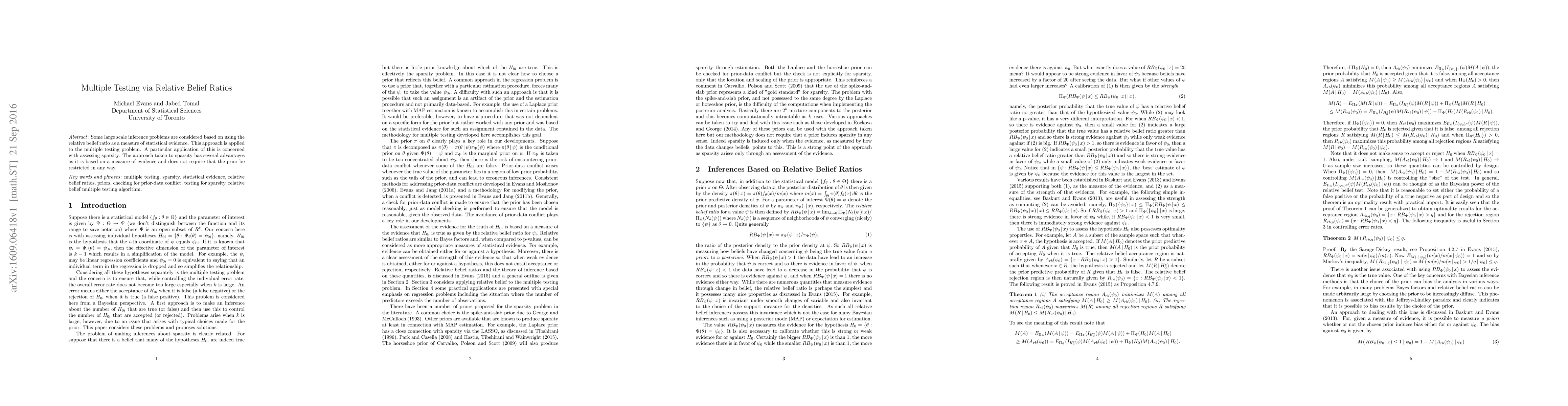 Some large scale inference problems are considered based on using the relative belief ratio as a measure of statistical evidence. This approach is applied to the multiple testing problem. A particular application of this is concerned with assessing sparsity. The approach taken to sparsity has several advantages as it is based on a measure of evidence and does not require that the prior be restricted in any way.