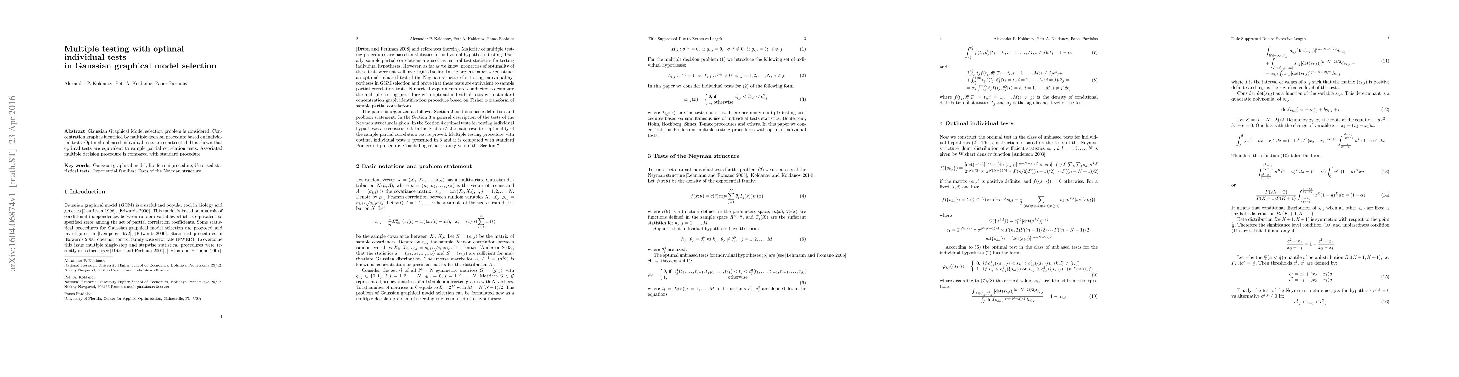 Gaussian Graphical Model selection problem is considered. Concentration graph is identified by multiple decision procedure based on individual tests. Optimal unbiased individual tests are constructed. It is shown that optimal tests are equivalent to sample partial correlation tests. Associated multiple decision procedure is compared with standard procedure.