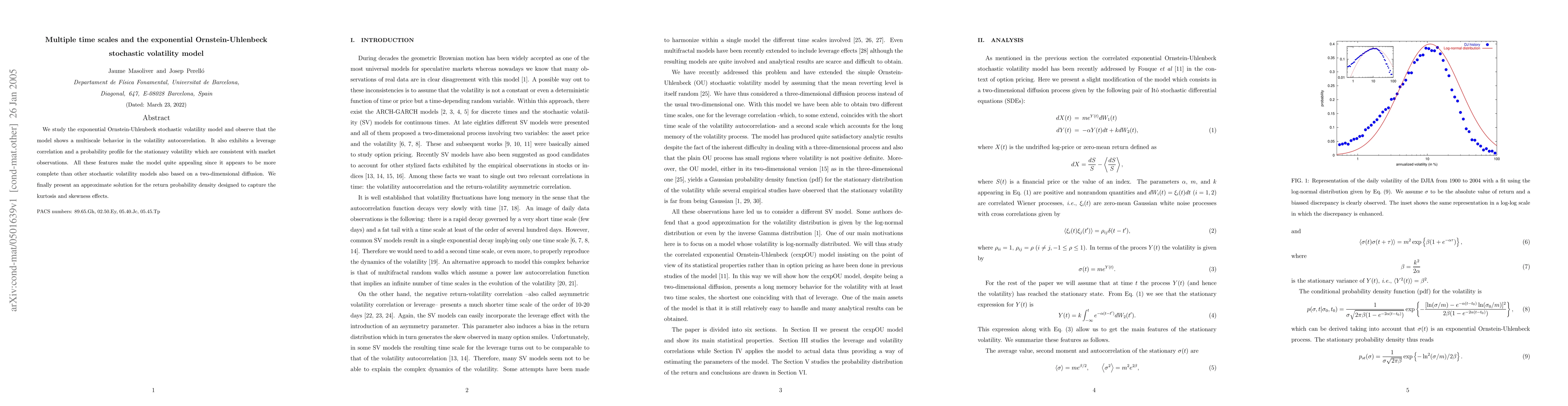 We study the exponential Ornstein-Uhlenbeck stochastic volatility model and observe that the model shows a multiscale behavior in the volatility autocorrelation. It also exhibits a leverage correlation and a probability profile for the stationary volatility which are consistent with market observations. All these features make the model quite appealing since it appears to be more complete than other stochastic volatility models also based on a two-dimensional diffusion. We finally present an approximate solution for the return probability density designed to capture the kurtosis and skewness effects.
