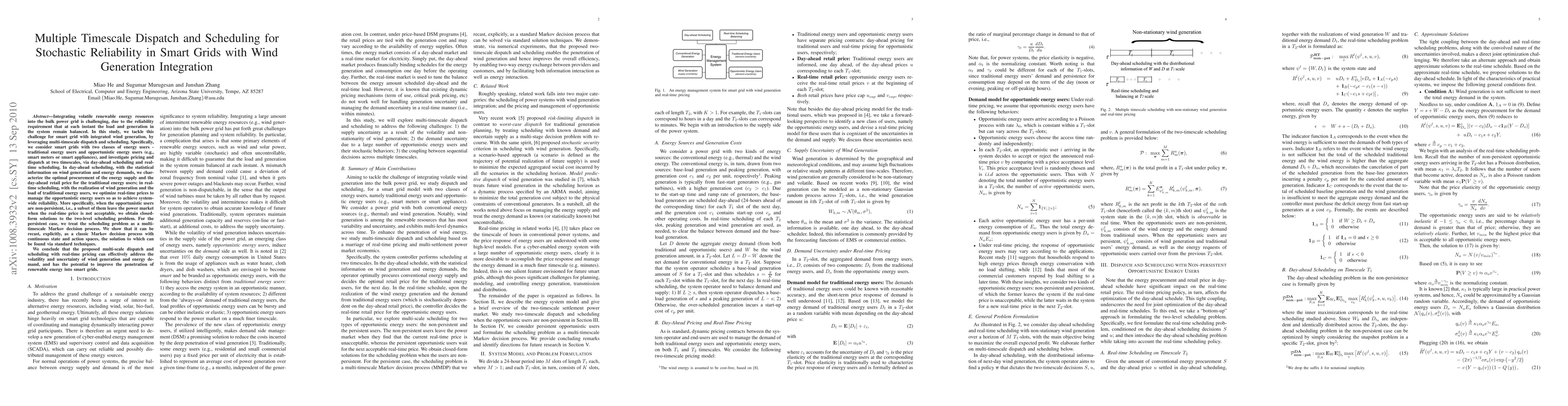 This paper proposes a multi-timescale dispatch and scheduling strategy for smart grids integrating wind generation, balancing load and generation through day-ahead and real-time pricing. It effectively manages both traditional and opportunistic energy users to enhance system reliability and improve renewable energy penetration.