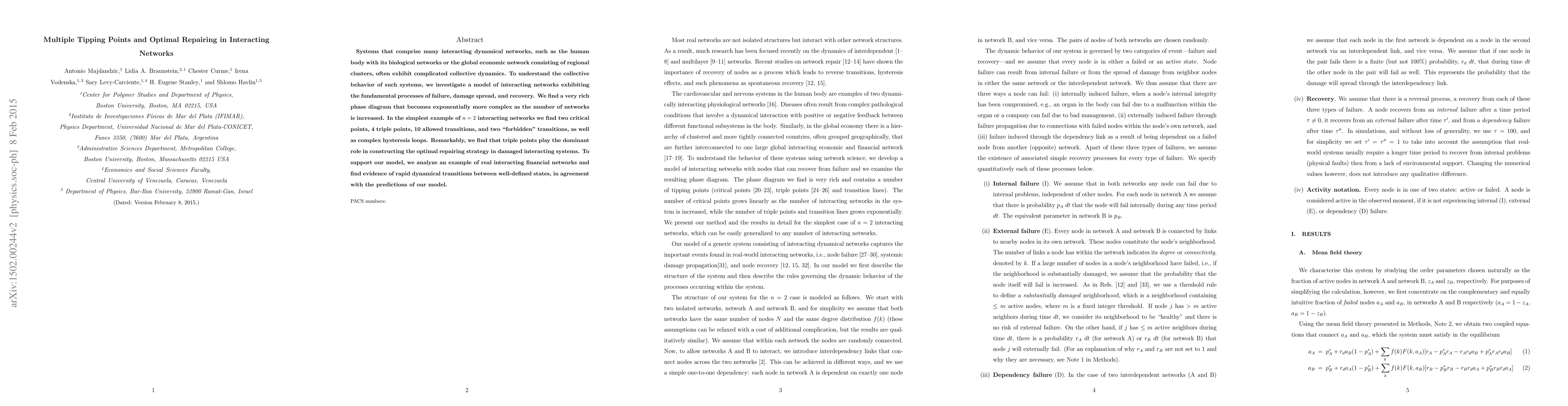 Systems that comprise many interacting dynamical networks, such as the human body with its biological networks or the global economic network consisting of regional clusters, often exhibit complicated collective dynamics. To understand the collective behavior of such systems, we investigate a model of interacting networks exhibiting the fundamental processes of failure, damage spread, and recovery. We find a very rich phase diagram that becomes exponentially more complex as the number of networks is increased. In the simplest example of $n=2$ interacting networks we find two critical points, 4 triple points, 10 allowed transitions, and two "forbidden" transitions, as well as complex hysteresis loops. Remarkably, we find that triple points play the dominant role in constructing the optimal repairing strategy in damaged interacting systems. To support our model, we analyze an example of real interacting financial networks and find evidence of rapid dynamical transitions between well-defined states, in agreement with the predictions of our model.