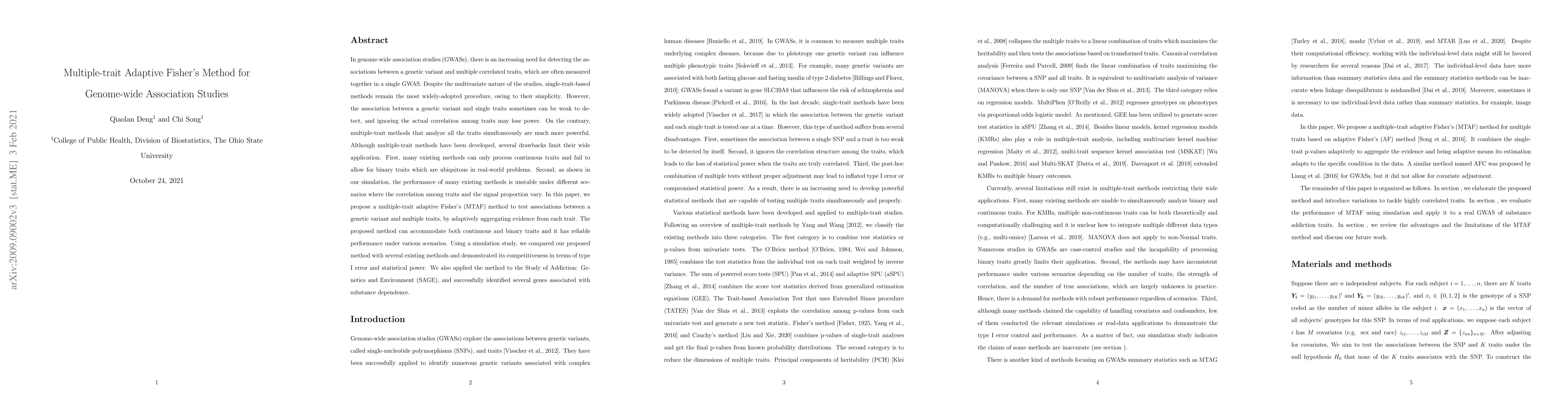 The paper proposes a multiple-trait adaptive Fisher's (MTAF) method for genome-wide association studies to detect associations between genetic variants and multiple correlated traits simultaneously, addressing the limitations of single-trait methods. The MTAF method shows improved performance in type I error control and statistical power compared to existing methods.