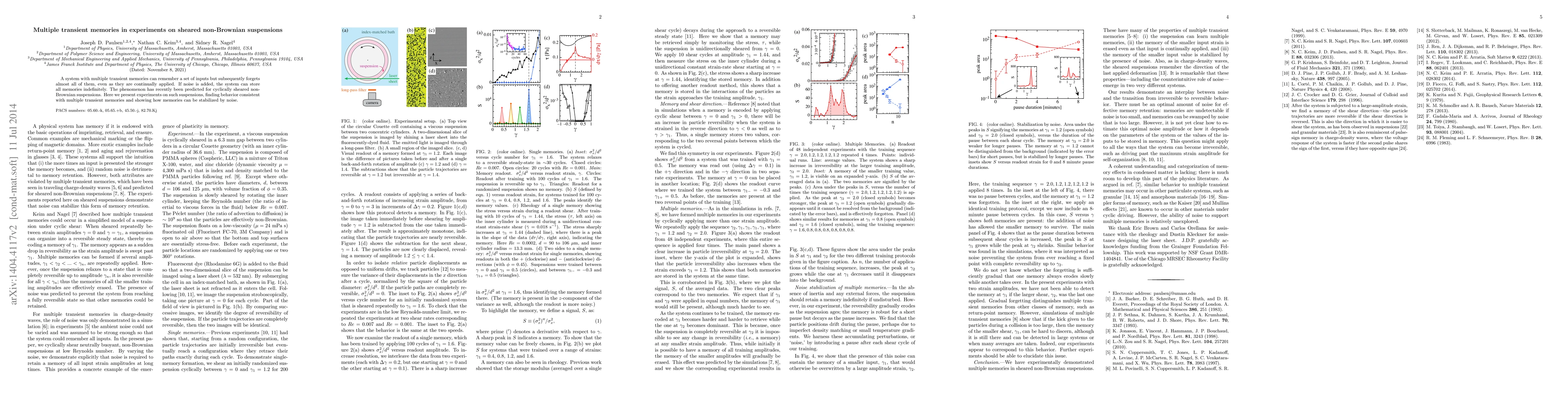 A system with multiple transient memories can remember a set of inputs but subsequently forgets almost all of them, even as they are continually applied. If noise is added, the system can store all memories indefinitely. The phenomenon has recently been predicted for cyclically sheared non-Brownian suspensions. Here we present experiments on such suspensions, finding behavior consistent with multiple transient memories and showing how memories can be stabilized by noise.