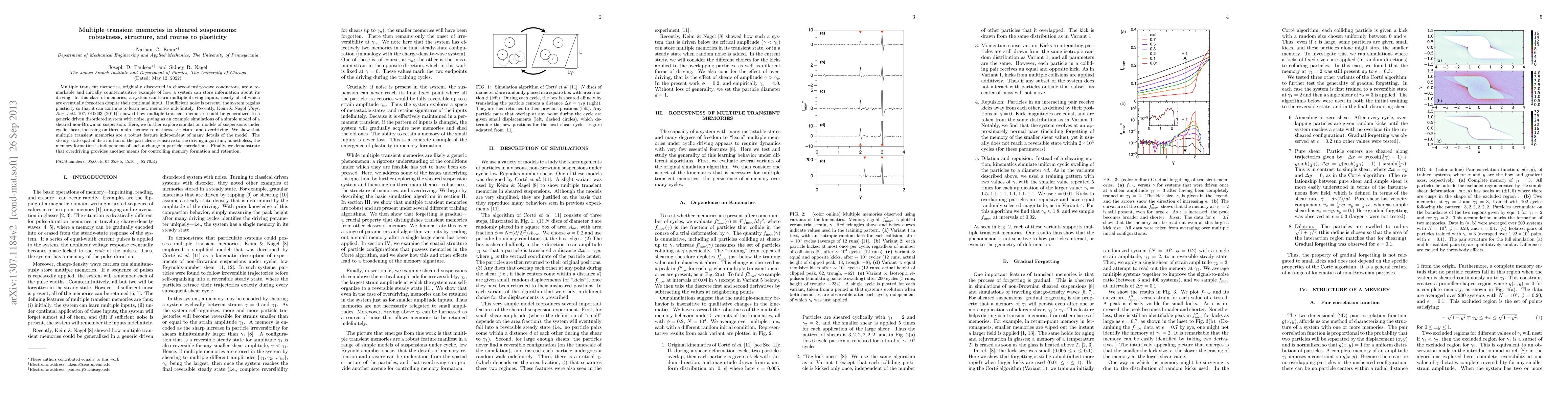 This paper explores multiple transient memories in sheared suspensions, demonstrating their robustness, structural independence, and plasticity control via overdriving, extending findings from charge-density-wave conductors to disordered systems.