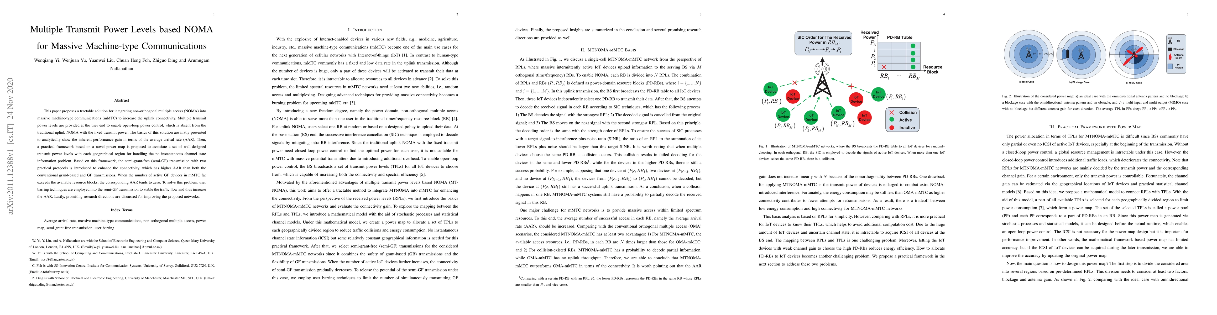 The paper proposes a tractable solution for integrating non-orthogonal multiple access (NOMA) into massive machine-type communications (mMTC) by introducing multiple transmit power levels (TPLs) for open-loop power control, addressing the lack of instantaneous channel state information (ICSI) in traditional uplink NOMA.