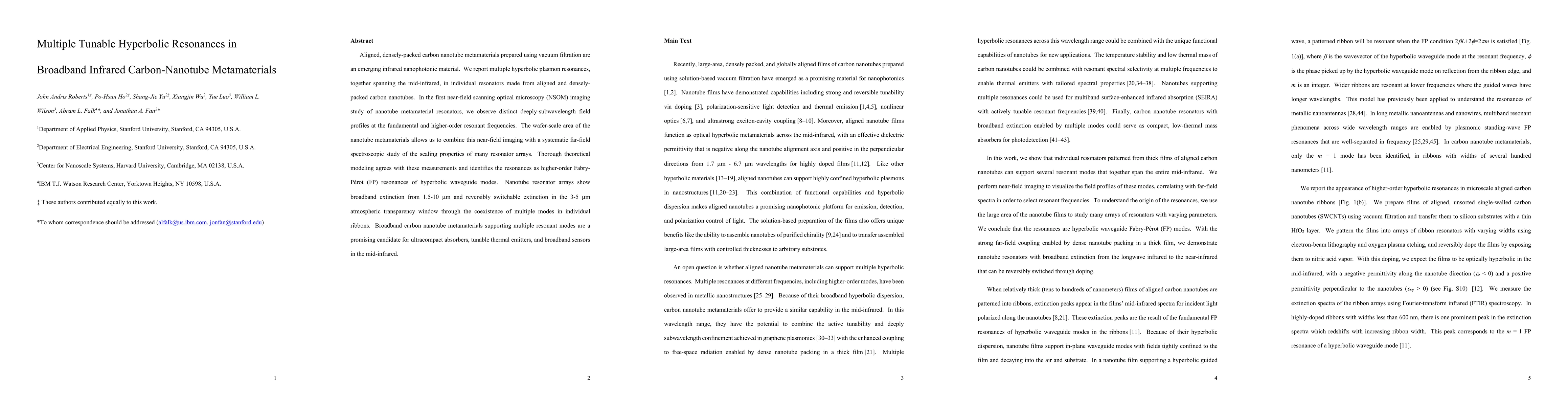 This paper reports on the development of carbon nanotube metamaterials with multiple tunable hyperbolic plasmon resonances spanning the mid-infrared spectrum. Near-field scanning optical microscopy and far-field spectroscopy reveal distinct field profiles and broadband extinction capabilities, positioning these materials as potential candidates for ultracompact absorbers, tunable thermal emitters, and broadband sensors.