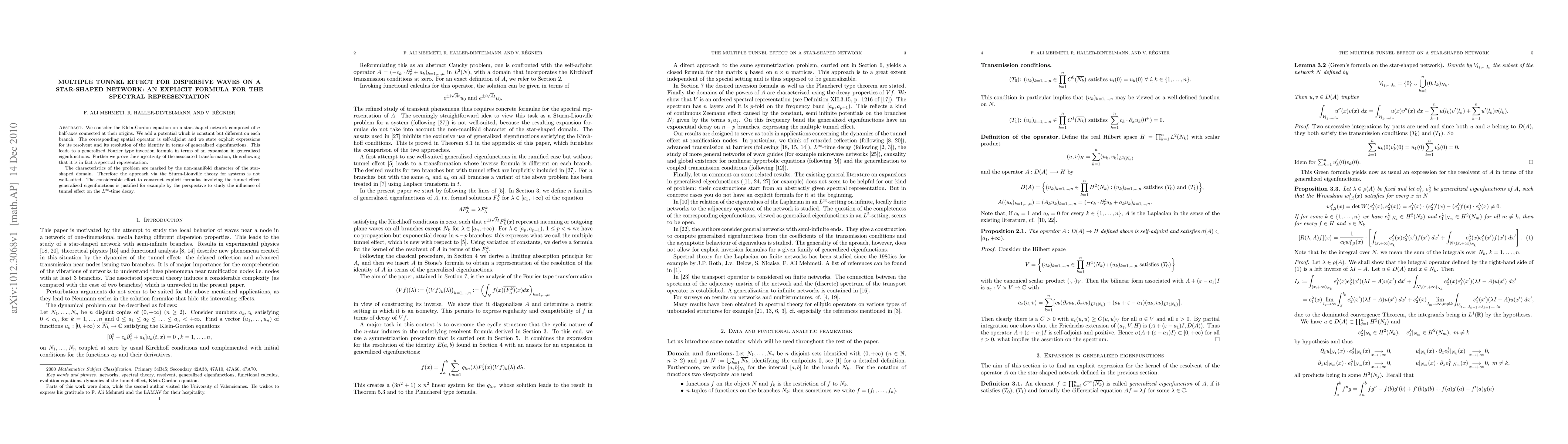 We consider the Klein-Gordon equation on a star-shaped network composed of n half-axes connected at their origins. We add a potential which is constant but different on each branch. The corresponding spatial operator is self-adjoint and we state explicit expressions for its resolvent and its resolution of the identity in terms of generalized eigenfunctions. This leads to a generalized Fourier type inversion formula in terms of an expansion in generalized eigenfunctions. Further we prove the surjectivity of the associated transformation, thus showing that it is in fact a spectral representation. The characteristics of the problem are marked by the non-manifold character of the star-shaped domain. Therefore the approach via the Sturm-Liouville theory for systems is not well-suited. The considerable effort to construct explicit formulas involving the tunnel effect generalized eigenfunctions is justified for example by the perspective to study the influence of tunnel effect on the L-infinity-time decay.