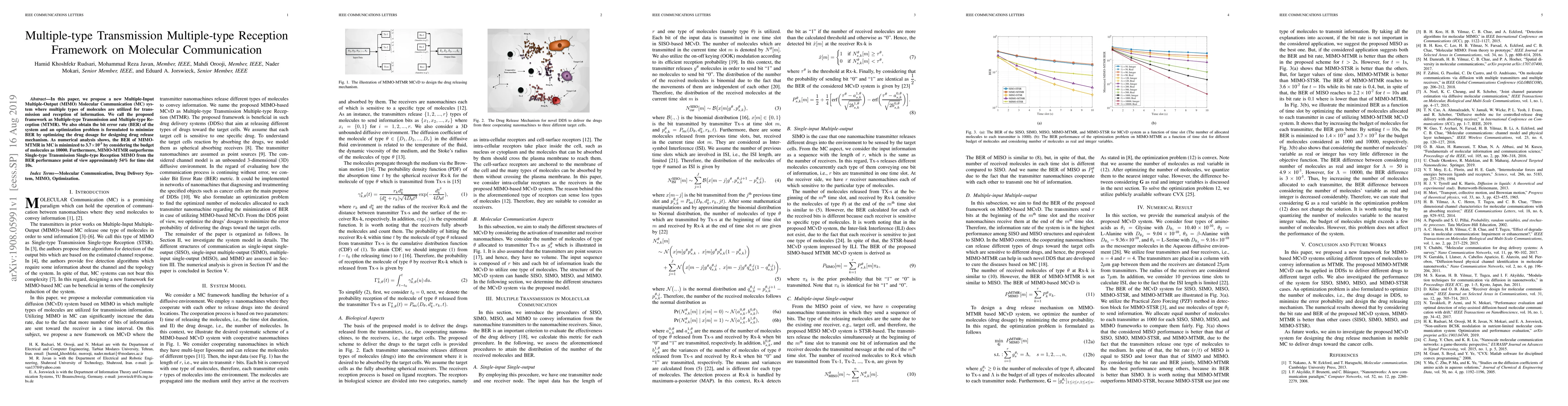 In this paper, we propose a new Multiple-Input Multiple-Output (MIMO) Molecular Communication (MC) system where multiple types of molecules are utilized for transmission and reception of information. We call the proposed framework as Multiple-type Transmission and Multiple-type Reception (MTMR). We also obtain the bit error rate (BER) of the system and an optimization problem is formulated to minimize BER by optimizing the drug dosage for designing drug release mechanism. As numerical analysis shows, the BER of MIMO-MTMR in MC is minimized to $\text{3.7}\times\text{10}^{\text{-3}}$ by considering the budget of molecules as 10000. Furthermore, MIMO-MTMR outperforms Single-type Transmission Single-type Reception MIMO from the BER performance point of view approximately 54% for time slot 10s.