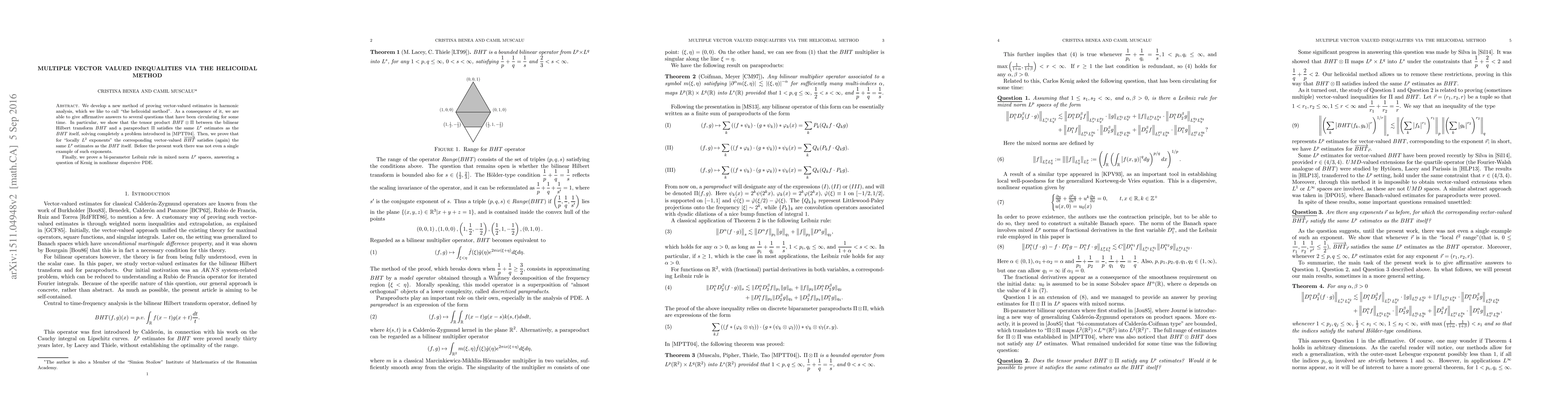 This paper introduces the helicoidal method to prove vector-valued inequalities in harmonic analysis, demonstrating its effectiveness by showing that the tensor product $BHT \otimes \Pi$ maintains $L^p$ estimates like the bilinear Hilbert transform. It also establishes $L^p$ estimates for locally $L^2$ exponents for $\overrightarrow{BHT}$, and resolves a bi-parameter Leibniz rule question in mixed norm $L^p$ spaces.