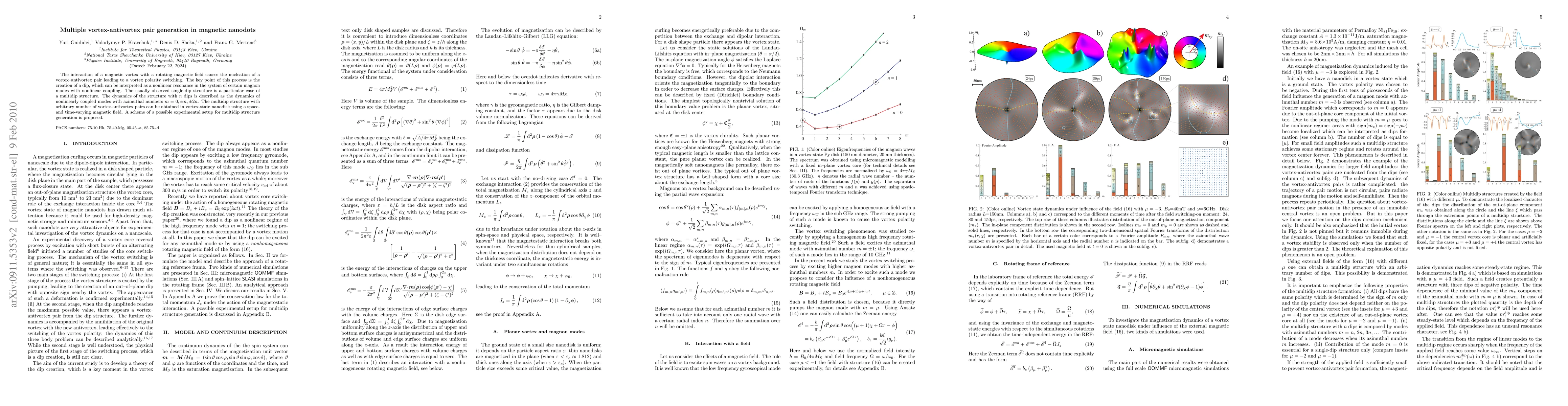 This paper investigates the generation of multiple vortex-antivortex pairs in magnetic nanodots under a rotating magnetic field, revealing a multidip structure due to nonlinear resonance in magnon modes. An experimental setup is proposed to achieve this multidip structure in vortex-state nanodisks.
