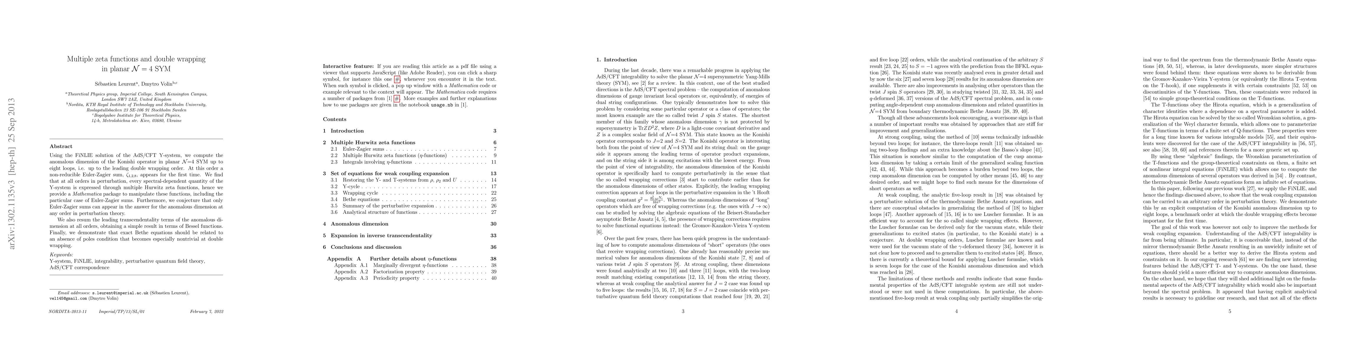 Using the FiNLIE solution of the AdS/CFT Y-system, we compute the anomalous dimension of the Konishi operator in planar N=4 SYM up to eight loops, i.e. up to the leading double wrapping order. At this order a non reducible Euler-Zagier sum, zeta(1,2,8), appears for the first time. We find that at all orders in perturbation, every spectral-dependent quantity of the Y-system is expressed through multiple Hurwitz zeta functions, hence we provide a Mathematica package to manipulate these functions, including the particular case of Euler-Zagier sums. Furthermore, we conjecture that only Euler-Zagier sums can appear in the answer for the anomalous dimension at any order in perturbation theory. We also resum the leading transcendentality terms of the anomalous dimension at all orders, obtaining a simple result in terms of Bessel functions. Finally, we demonstrate that exact Bethe equations should be related to an absence of poles condition that becomes especially nontrivial at double wrapping.