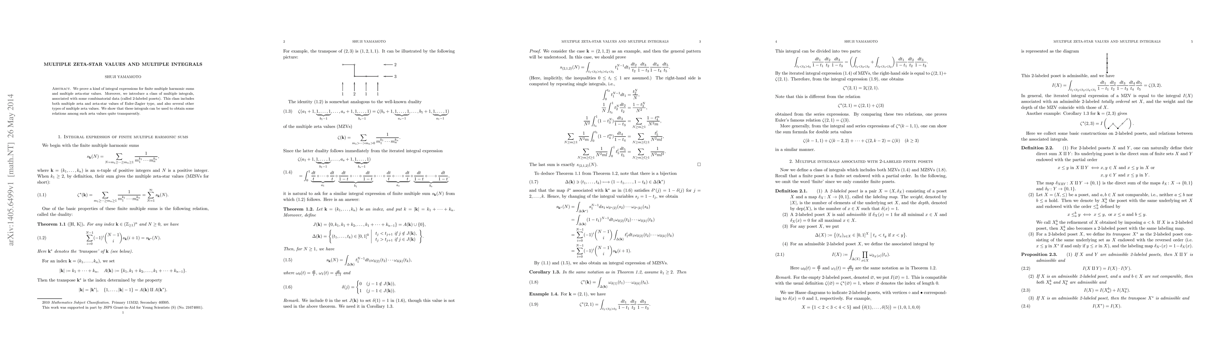 The paper establishes integral expressions for finite multiple harmonic sums and multiple zeta-star values, introducing a class of multiple integrals linked to combinatorial data. These integrals facilitate clear relations among various types of multiple zeta values.