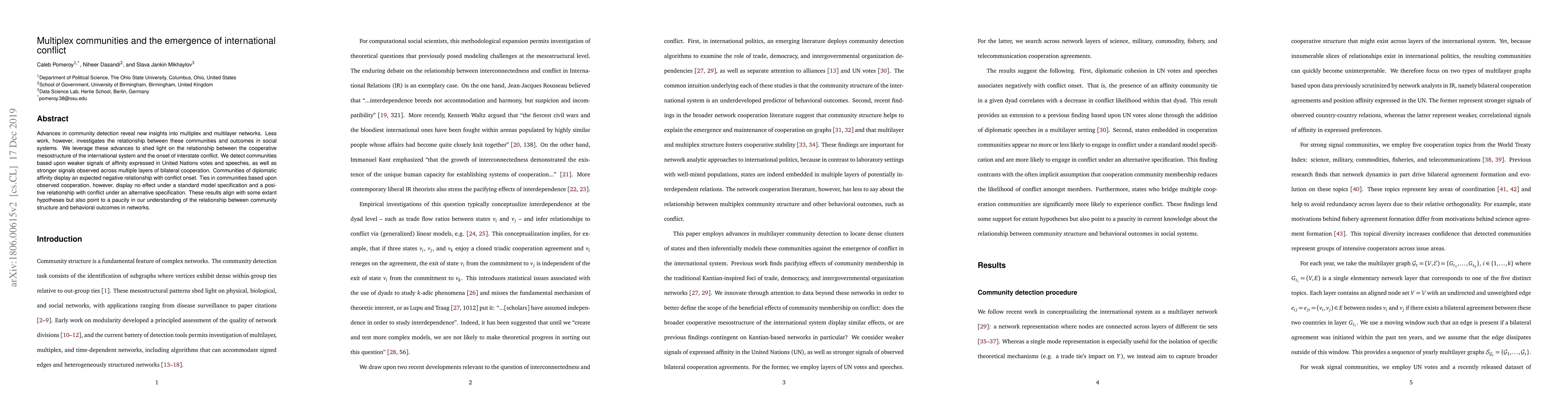 Advances in community detection reveal new insights into multiplex and multilayer networks. Less work, however, investigates the relationship between these communities and outcomes in social systems. We leverage these advances to shed light on the relationship between the cooperative mesostructure of the international system and the onset of interstate conflict. We detect communities based upon weaker signals of affinity expressed in United Nations votes and speeches, as well as stronger signals observed across multiple layers of bilateral cooperation. Communities of diplomatic affinity display an expected negative relationship with conflict onset. Ties in communities based upon observed cooperation, however, display no effect under a standard model specification and a positive relationship with conflict under an alternative specification. These results align with some extant hypotheses but also point to a paucity in our understanding of the relationship between community structure and behavioral outcomes in networks.
