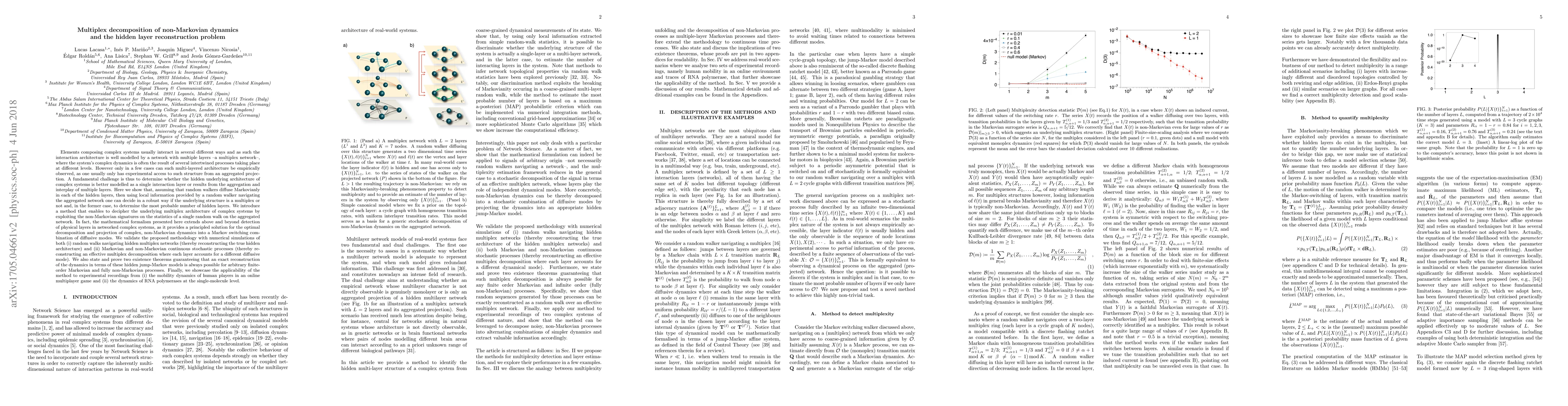 Elements composing complex systems usually interact in several different ways and as such the interaction architecture is well modelled by a multiplex network. However often this architecture is hidden, as one usually only has experimental access to an aggregated projection. A fundamental challenge is thus to determine whether the hidden underlying architecture of complex systems is better modelled as a single interaction layer or results from the aggregation and interplay of multiple layers. Here we show that using local information provided by a random walker navigating the aggregated network one can decide in a robust way if the underlying structure is a multiplex or not and, in the former case, to determine the most probable number of hidden layers. As a byproduct, we show that the mathematical formalism also provides a principled solution for the optimal decomposition and projection of complex, non-Markovian dynamics into a Markov switching combination of diffusive modes. We validate the proposed methodology with numerical simulations of both (i) random walks navigating hidden multiplex networks (thereby reconstructing the true hidden architecture) and (ii) Markovian and non-Markovian continuous stochastic processes (thereby reconstructing an effective multiplex decomposition where each layer accounts for a different diffusive mode). We also state and prove two existence theorems guaranteeing that an exact reconstruction of the dynamics in terms of these hidden jump-Markov models is always possible for arbitrary finite-order Markovian and fully non-Markovian processes. Finally, we showcase the applicability of the method to experimental recordings from (i) the mobility dynamics of human players in an online multiplayer game and (ii) the dynamics of RNA polymerases at the single-molecule level.