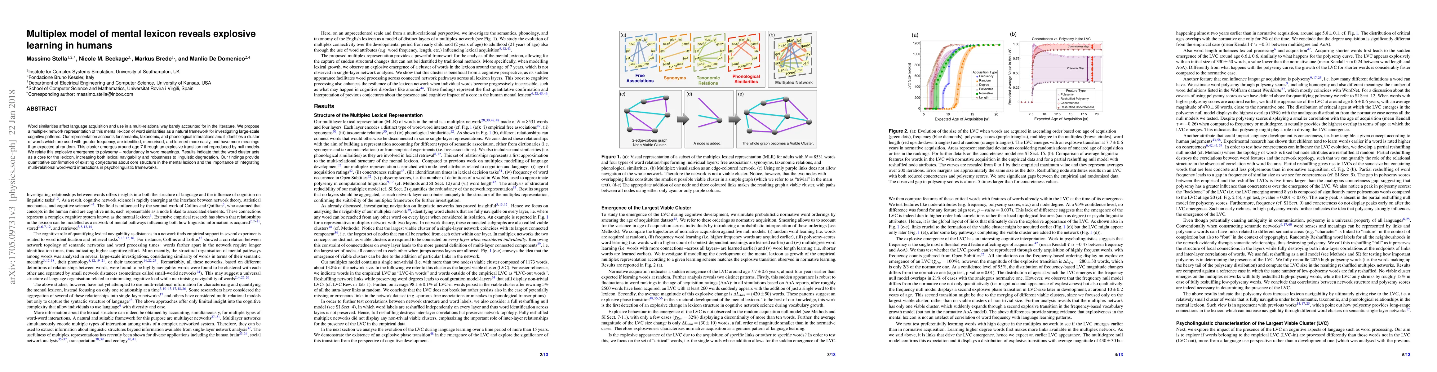 Word similarities affect language acquisition and use in a multi-relational way barely accounted for in the literature. We propose a multiplex network representation of this mental lexicon of word similarities as a natural framework for investigating large-scale cognitive patterns. Our representation accounts for semantic, taxonomic, and phonological interactions and it identifies a cluster of words which are used with greater frequency, are identified, memorised, and learned more easily, and have more meanings than expected at random. This cluster emerges around age 7 through an explosive transition not reproduced by null models. We relate this explosive emergence to polysemy -- redundancy in word meanings. Results indicate that the word cluster acts as a core for the lexicon, increasing both lexical navigability and robustness to linguistic degradation. Our findings provide quantitative confirmation of existing conjectures about core structure in the mental lexicon and the importance of integrating multi-relational word-word interactions in psycholinguistic frameworks.