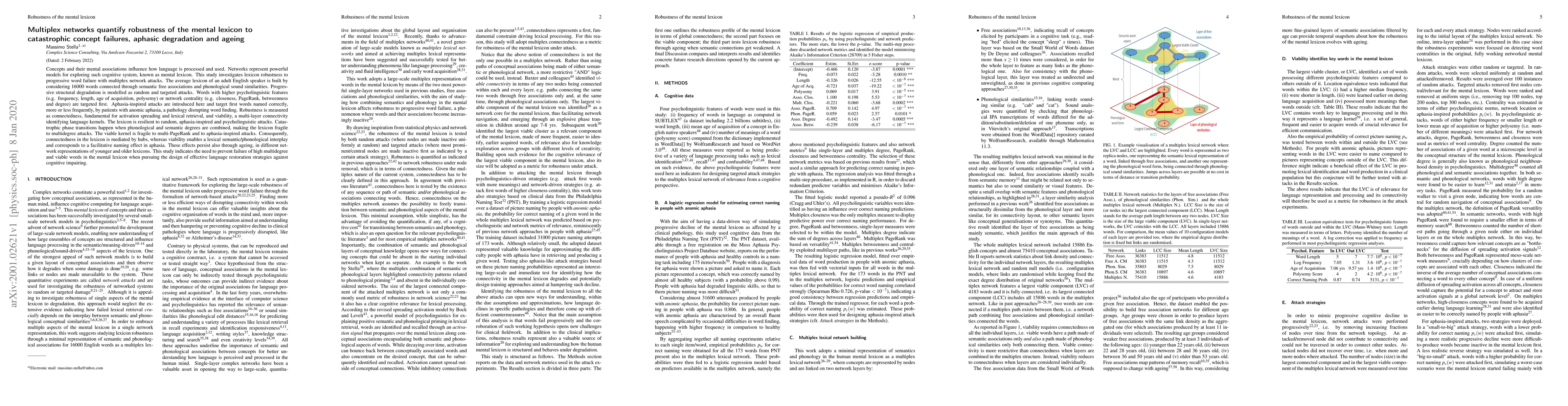Concepts and their mental associations influence how language is processed and used. Networks represent powerful models for exploring such cognitive system, known as mental lexicon. This study investigates lexicon robustness to progressive word failure with multiplex network attacks. The average lexicon of an adult English speaker is built by considering 16000 words connected through semantic free associations and phonological sound similarities. Progressive structural degradation is modelled as random and targeted attacks. Words with higher psycholinguistic features (e.g. frequency, length, age of acquisition, polysemy) or network centrality (e.g. closeness, PageRank, betweenness and degree) are targeted first. Aphasia-inspired attacks are introduced here and target first words named correctly, more or less frequently, by patients with anomic aphasia, a pathology disrupting word finding. Robustness is measured as connectedness, fundamental for activation spreading and lexical retrieval, and viability, a multi-layer connectivity identifying language kernels. The lexicon is resilient to random, aphasia-inspired and psycholinguistic attacks. Catastrophic phase transitions happen when phonological and semantic degrees are combined, making the lexicon fragile to multidegree attacks. The viable kernel is fragile to multi-PageRank and to aphasia-inspired attacks. Consequently, connectedness in the lexicon is mediated by hubs, whereas viability enables a lexical semantic/phonological interplay and corresponds to a facilitative naming effect in aphasia. These effects persist also through ageing, in different network representations of younger and older lexicons. This study indicates the need to prevent failure of high multidegree and viable words in the mental lexicon when pursuing the design of effective language restoration strategies against cognitive impairing.