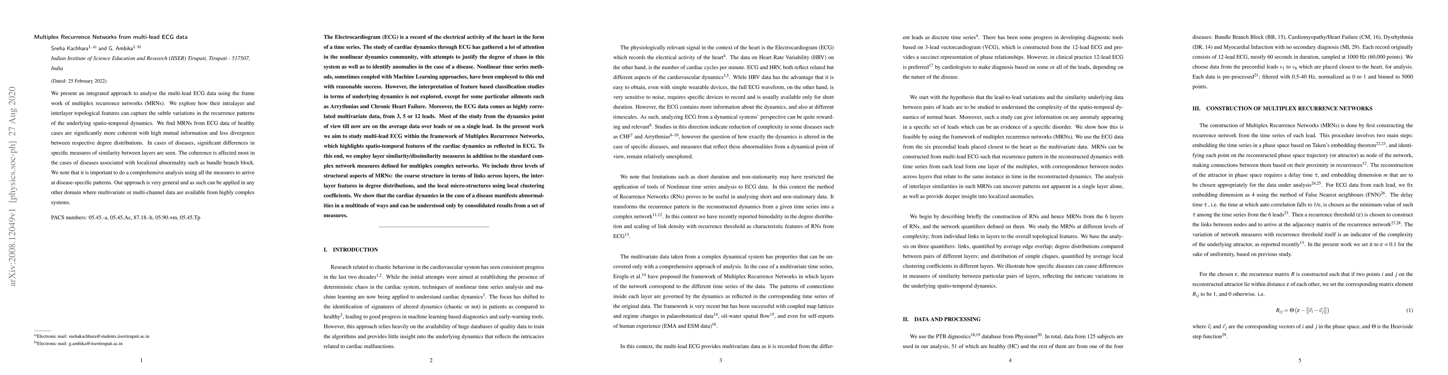This paper introduces multiplex recurrence networks (MRNs) to analyze multi-lead ECG data, revealing that healthy cases exhibit higher coherence and mutual information compared to diseased cases, especially those with localized abnormalities like bundle branch block. The study emphasizes the importance of comprehensive analysis using multiple measures for identifying disease-specific patterns.