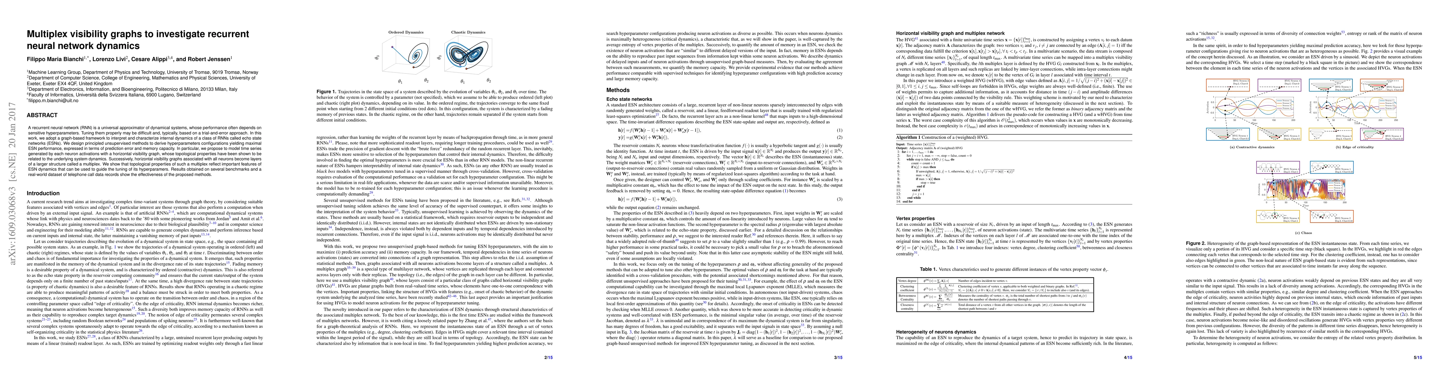 A recurrent neural network (RNN) is a universal approximator of dynamical systems, whose performance often depends on sensitive hyperparameters. Tuning of such hyperparameters may be difficult and, typically, based on a trial-and-error approach. In this work, we adopt a graph-based framework to interpret and characterize the internal RNN dynamics. Through this insight, we are able to design a principled unsupervised method to derive configurations with maximized performances, in terms of prediction error and memory capacity. In particular, we propose to model time series of neurons activations with the recently introduced horizontal visibility graphs, whose topological properties reflect important dynamical features of the underlying dynamic system. Successively, each graph becomes a layer of a larger structure, called multiplex. We show that topological properties of such a multiplex reflect important features of RNN dynamics and are used to guide the tuning procedure. To validate the proposed method, we consider a class of RNNs called echo state networks. We perform experiments and discuss results on several benchmarks and real-world dataset of call data records.