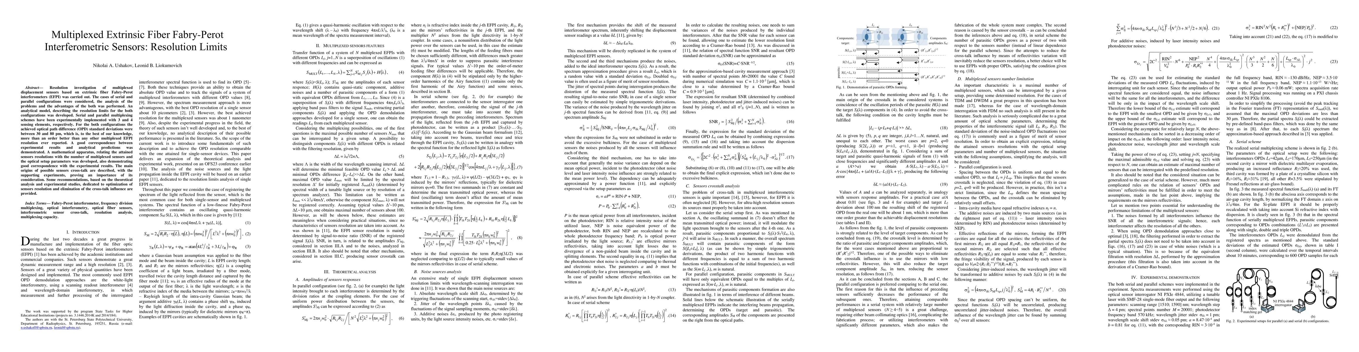 The research investigated resolution limits of multiplexed displacement sensors based on extrinsic fiber Fabry-Perot interferometers (EFPI) using both serial and parallel configurations. An analytical model was developed to describe resolution limits for both configurations, and experimental implementations with 3 and 4 sensing elements were conducted.