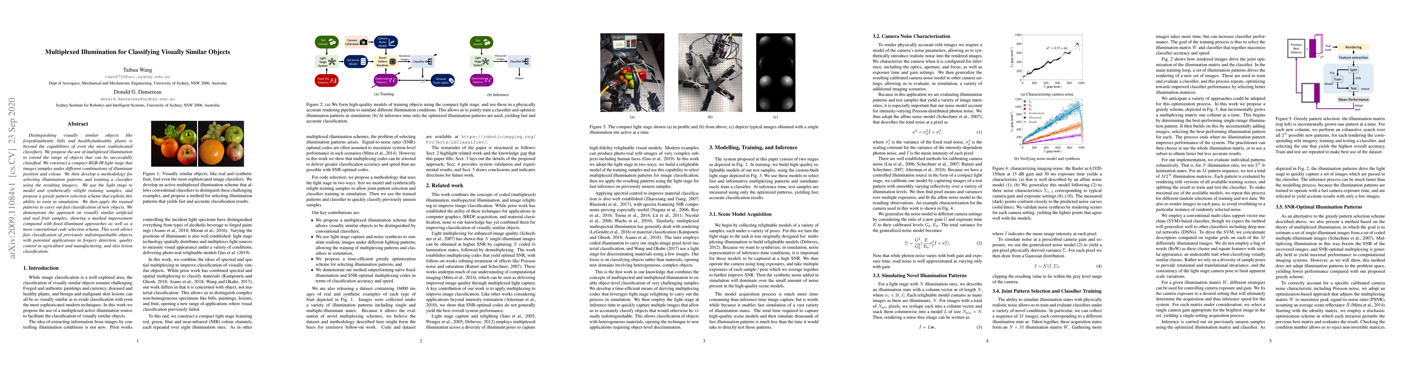 Distinguishing visually similar objects like forged/authentic bills and healthy/unhealthy plants is beyond the capabilities of even the most sophisticated classifiers. We propose the use of multiplexed illumination to extend the range of objects that can be successfully classified. We construct a compact RGB-IR light stage that images samples under different combinations of illuminant position and colour. We then develop a methodology for selecting illumination patterns and training a classifier using the resulting imagery. We use the light stage to model and synthetically relight training samples, and propose a greedy pattern selection scheme that exploits this ability to train in simulation. We then apply the trained patterns to carry out fast classification of new objects. We demonstrate the approach on visually similar artificial and real fruit samples, showing a marked improvement compared with fixed-illuminant approaches as well as a more conventional code selection scheme. This work allows fast classification of previously indistinguishable objects, with potential applications in forgery detection, quality control in agriculture and manufacturing, and skin lesion classification.