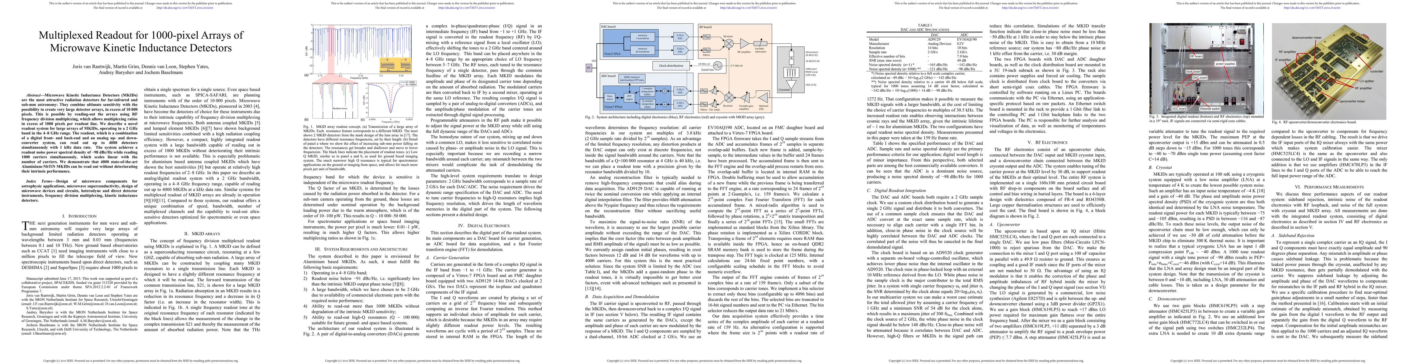 This research presents a novel readout system for large arrays of Microwave Kinetic Inductance Detectors (MKIDs), achieving up to 4000 simultaneous readouts with a 1 kHz data rate in a 4-8 GHz band, maintaining high sensitivity and performance. The system uses RF frequency division multiplexing and demonstrates a readout noise power spectral density of -98 dBc/Hz.