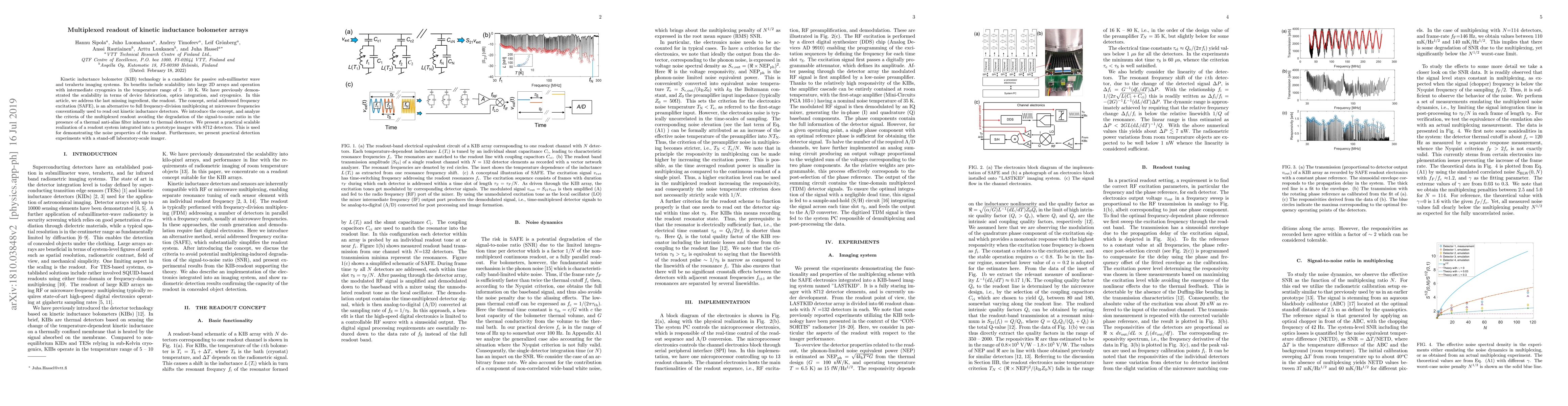 Kinetic inductance bolometer (KIB) technology is a candidate for passive sub-millimeter wave and terahertz imaging systems. Its benefits include scalability into large 2D arrays and operation with intermediate cryogenics in the temperature range of 5 -- 10 K. We have previously demonstrated the scalability in terms of device fabrication, optics integration, and cryogenics. In this article, we address the last missing ingredient, the readout. The concept, serial addressed frequency excitation (SAFE), is an alternative to full frequency-division multiplexing at microwave frequencies conventionally used to read out kinetic inductance detectors. We introduce the concept, and analyze the criteria of the multiplexed readout avoiding the degradation of the signal-to-noise ratio in the presence of a thermal anti-alias filter inherent to thermal detectors. We present a practical scalable realization of a readout system integrated into a prototype imager with 8712 detectors. This is used for demonstrating the noise properties of the readout. Furthermore, we present practical detection experiments with a stand-off laboratory-scale imager.