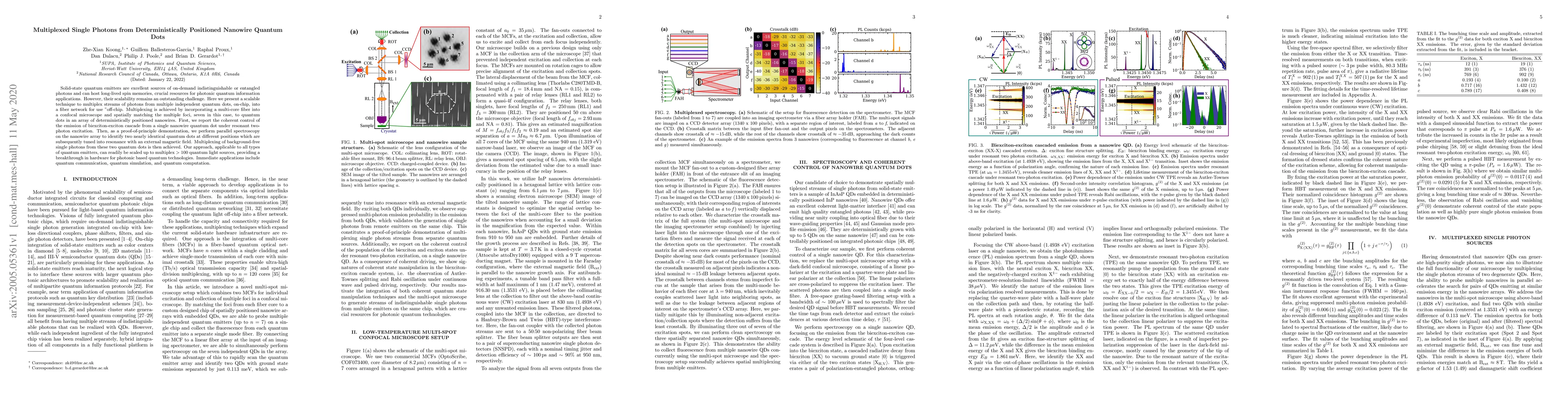 Solid-state quantum emitters are excellent sources of on-demand indistinguishable or entangled photons and can host long-lived spin memories, crucial resources for photonic quantum information applications. However, their scalability remains an outstanding challenge. Here we present a scalable technique to multiplex streams of photons from multiple independent quantum dots, on-chip, into a fiber network for use off-chip. Multiplexing is achieved by incorporating a multi-core fiber into a confocal microscope and spatially matching the multiple foci, seven in this case, to quantum dots in an array of deterministically positioned nanowires. First, we report the coherent control of the emission of biexciton-exciton cascade from a single nanowire quantum dot under resonant two-photon excitation. Then, as a proof-of-principle demonstration, we perform parallel spectroscopy on the nanowire array to identify two nearly identical quantum dots at different positions which are subsequently tuned into resonance with an external magnetic field. Multiplexing of background-free single photons from these two quantum dots is then achieved. Our approach, applicable to all types of quantum emitters, can readily be scaled up to multiplex $>100$ quantum light sources, providing a breakthrough in hardware for photonic based quantum technologies. Immediate applications include quantum communication, quantum simulation, and quantum computation.