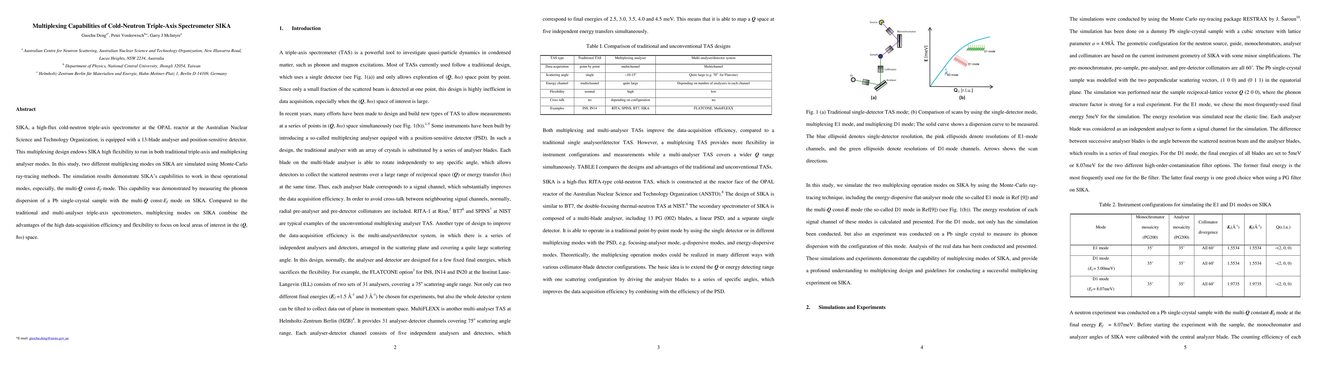 The SIKA cold-neutron triple-axis spectrometer features a multiplexing design that allows high flexibility in both traditional and innovative operational modes, as demonstrated through simulation and phonon dispersion measurements on a Pb single-crystal. This multiplexing enhances data-acquisition efficiency and enables targeted analysis in specific regions of the (Q, w) space.