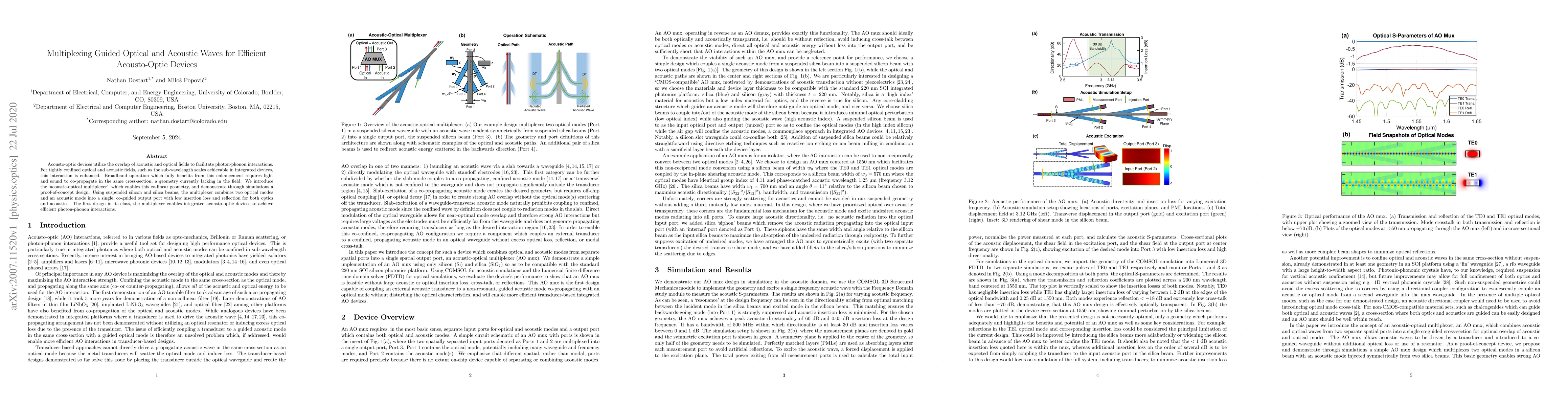 This paper introduces an "acoustic-optical multiplexer" that combines optical and acoustic waves in a single cross-section, enhancing photon-phonon interactions in acousto-optic devices. The design, demonstrated through simulations, uses suspended silicon and silica beams to achieve low insertion loss and reflection for both optical and acoustic modes.