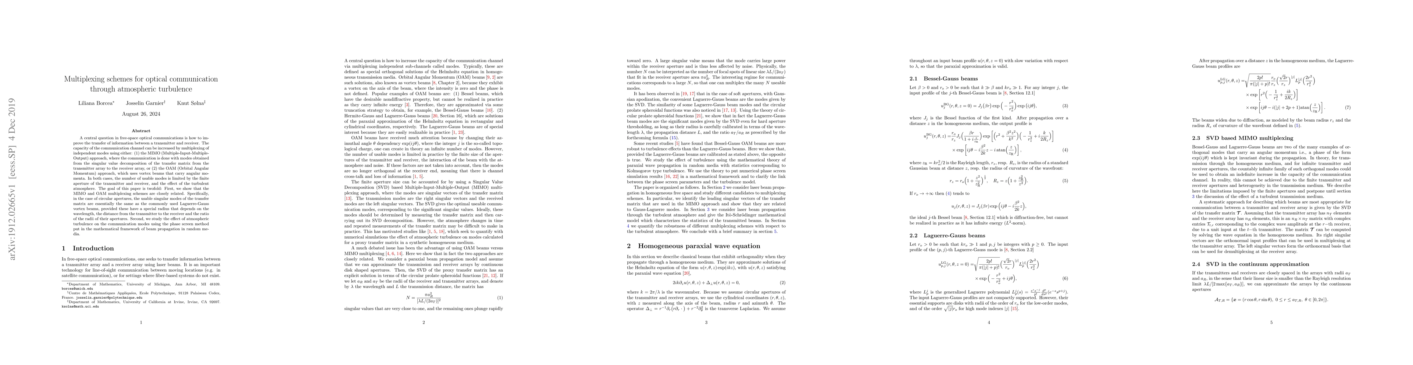 A central question in free-space optical communications is how to improve the transfer of information between a transmitter and receiver. The capacity of the communication channel can be increased by multiplexing of independent modes using either: (1) the MIMO (Multiple-Input-Multiple- Output) approach, where the communication is done with modes obtained from the singular value decomposition of the transfer matrix from the transmitter array to the receiver array, or (2) the OAM (Orbital Angular Momentum) approach, which uses vortex beams that carry angular momenta. In both cases, the number of usable modes is limited by the finite aperture of the transmitter and receiver, and the effect of the turbulent atmosphere. The goal of this paper is twofold: First, we show that the MIMO and OAM multiplexing schemes are closely related. Specifically, in the case of circular apertures, the usable singular modes of the transfer matrix are essentially the same as the commonly used Laguerre-Gauss vortex beams, provided these have a special radius that depends on the wavelength, the distance from the transmitter to the receiver and the ratio of the radii of their apertures. Second, we study the effect of atmospheric turbulence on the communication modes using the phase screen method put in the mathematical framework of beam propagation in random media.