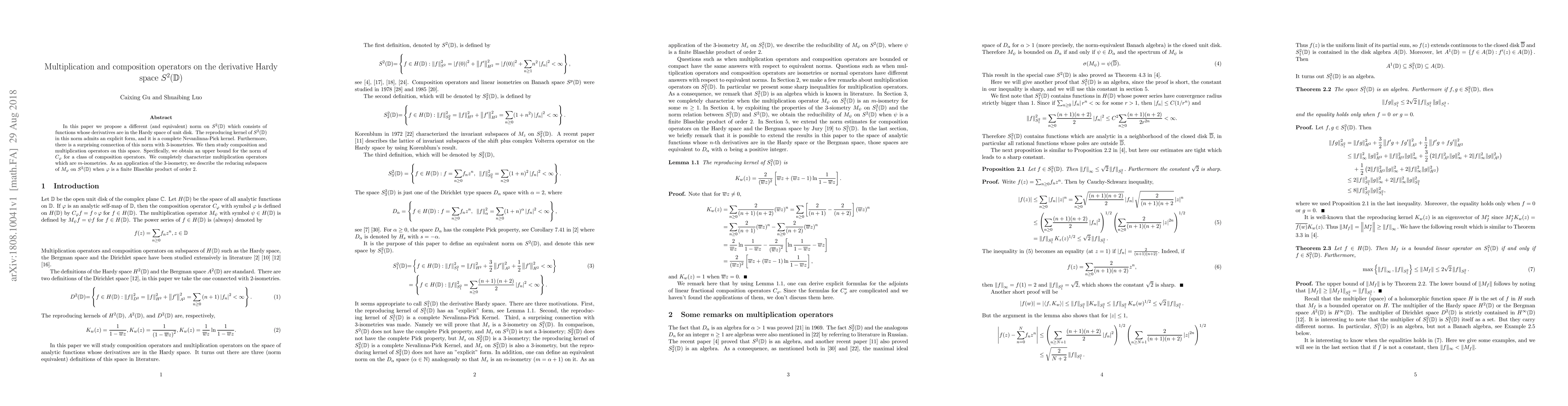 This paper introduces an alternative norm for the derivative Hardy space $S^{2}({\mathbb{D}})$, revealing an explicit form for its reproducing kernel. It explores composition and multiplication operators on this space, establishing an upper bound for composition operators and characterizing multiplication operators that are $m$-isometries, with applications to reducing subspaces of finite Blaschke products of order 2.