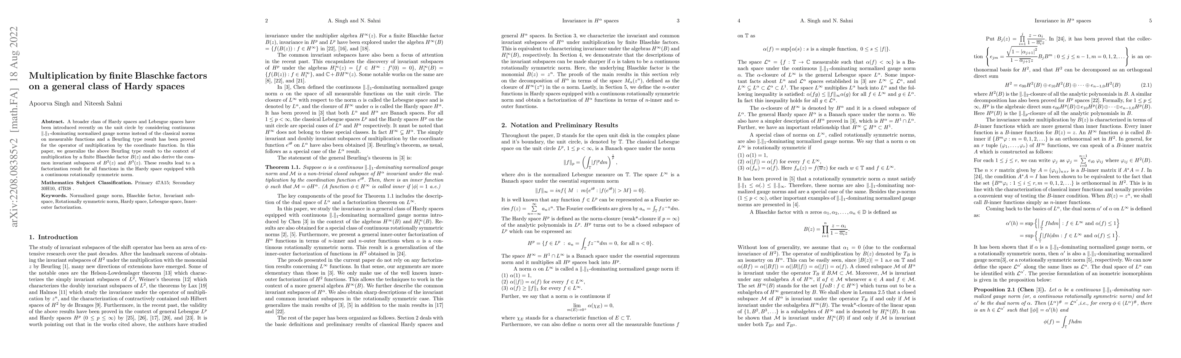 A broader class of Hardy spaces and Lebesgue spaces have been introduced recently on the unit circle by considering continuous $\|.\|_1$-dominating normalized gauge norms instead of the classical norms on measurable functions and a Beurling type result has been proved for the operator of multiplication by the coordinate function. In this paper, we generalize the above Beurling type result to the context of multiplication by a finite Blaschke factor $B(z)$ and also derive the common invariant subspaces of $B^2(z)$ and $B^3(z)$. These results lead to a factorization result for all functions in the Hardy space equipped with a continuous rotationally symmetric norm.