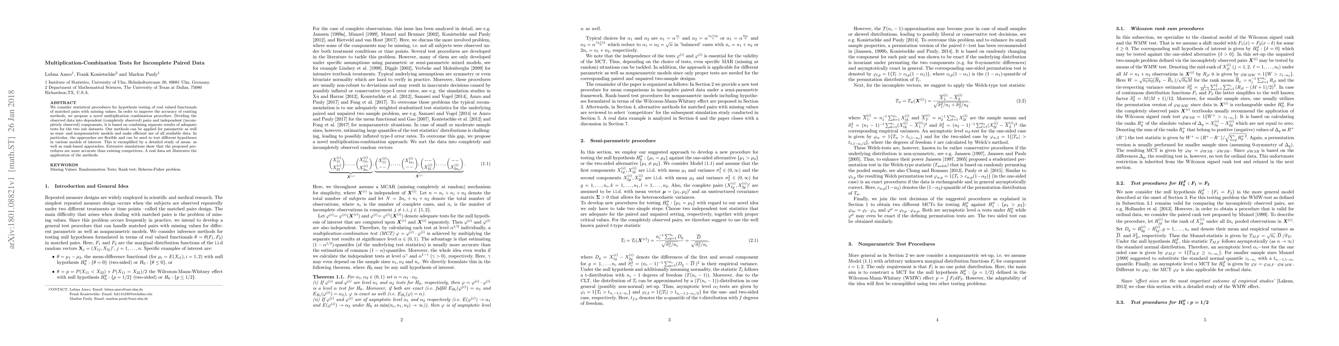 We consider statistical procedures for hypothesis testing of real valued functionals of matched pairs with missing values. In order to improve the accuracy of existing methods, we propose a novel multiplication combination procedure. Dividing the observed data into dependent (completely observed) pairs and independent (incompletely observed) components, it is based on combining separate results of adequate tests for the two sub datasets. Our methods can be applied for parametric as well as semi- and nonparametric models and make efficient use of all available data. In particular, the approaches are flexible and can be used to test different hypotheses in various models of interest. This is exemplified by a detailed study of mean- as well as rank-based apporaches. Extensive simulations show that the proposed procedures are more accurate than existing competitors. A real data set illustrates the application of the methods.
