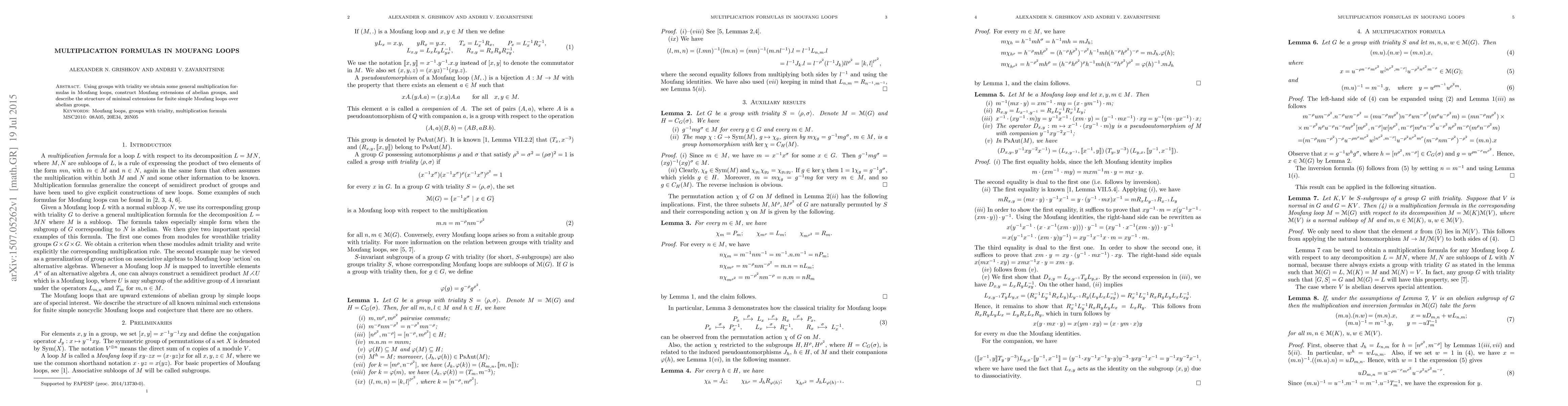 Using groups with triality we obtain some general multiplication formulas in Moufang loops, construct Moufang extensions of abelian groups, and describe the structure of minimal extensions for finite simple Moufang loops over abelian groups.