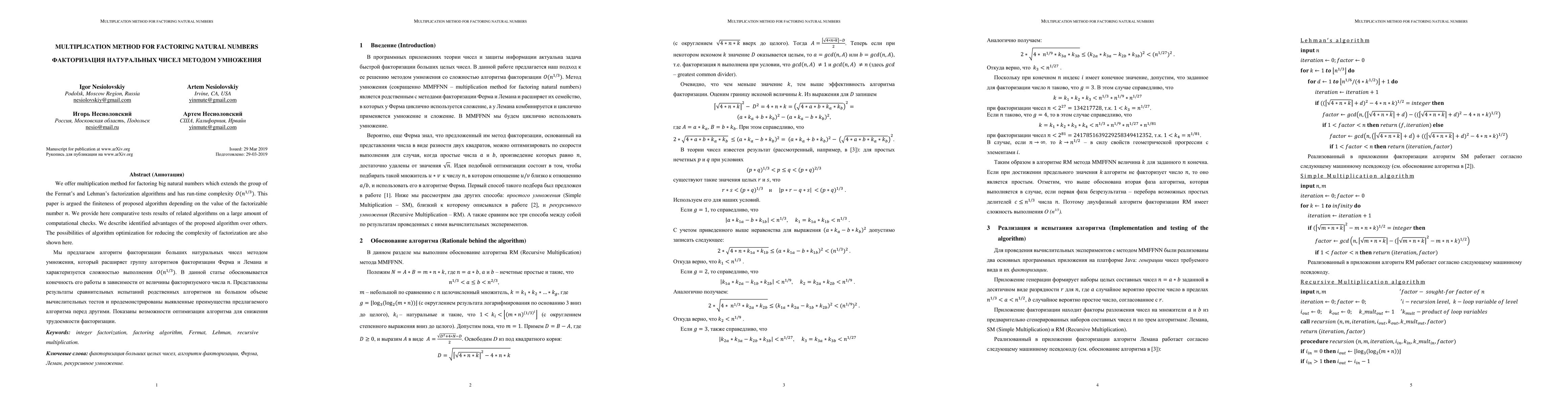 We offer multiplication method for factoring big natural numbers which extends the group of the Fermat's and Lehman's factorization algorithms and has run-time complexity $O(n^{1/3})$. This paper is argued the finiteness of proposed algorithm depending on the value of the factorizable number n. We provide here comparative tests results of related algorithms on a large amount of computational checks. We describe identified advantages of the proposed algorithm over others. The possibilities of algorithm optimization for reducing the complexity of factorization are also shown here.