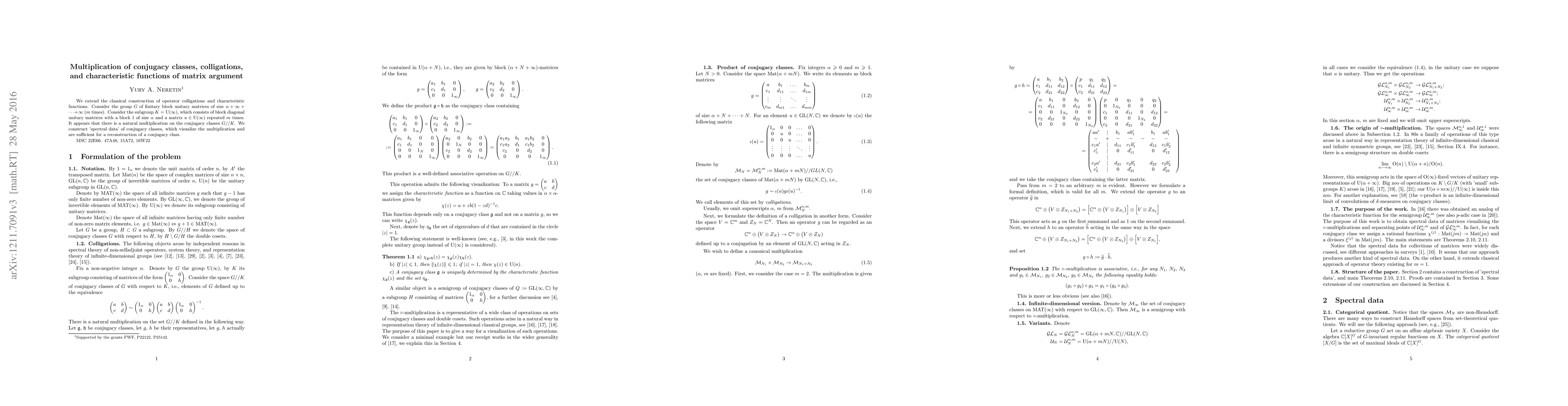 We extend the classical construction of operator colligations and characteristic functions. Consider the group $G$ of finite block unitary matrices of size $\alpha+\infty+...+\infty$ ($k$ times). Consider the subgroup $K=U(\infty)$, which consists of block diagonal unitary matrices (with a block 1 of size $\alpha$ and a matrix $u\in U(\infty)$ repeated $k$ times). It appears that there is a natural multiplication on the conjugacy classes $G//K$. We construct 'spectral data' of conjugacy classes, which visualize the multiplication and are sufficient for a reconstruction of a conjugacy class.