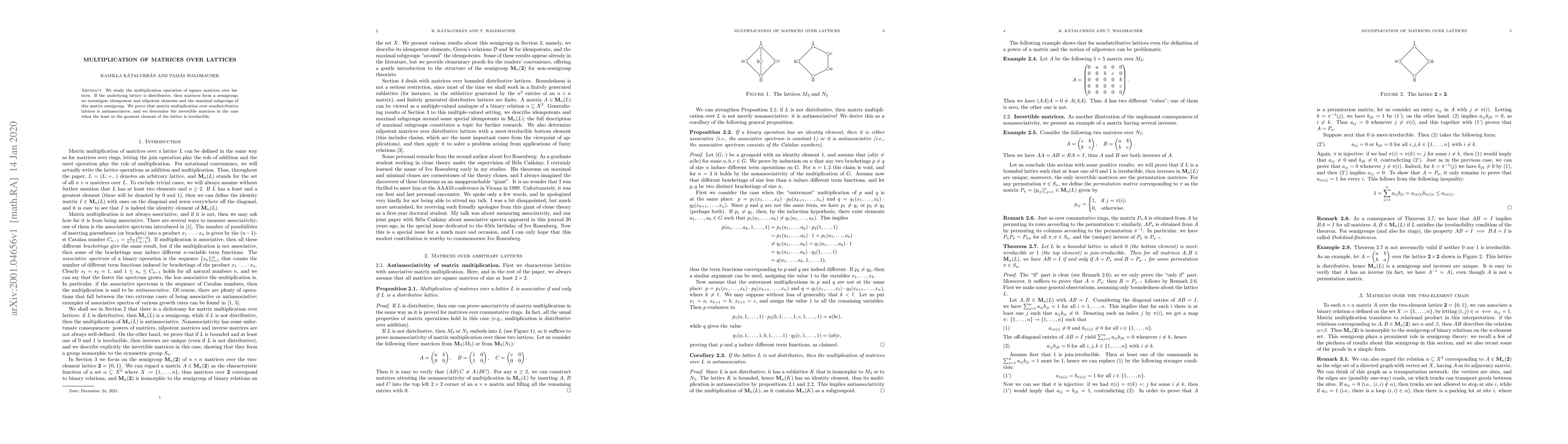 This paper explores the multiplication of square matrices over distributive lattices, identifying idempotent and nilpotent elements and maximal subgroups within the resulting matrix semigroup. It also examines matrix multiplication over nondistributive lattices, proving antiassociativity, and determines invertible matrices when the lattice's least or greatest element is irreducible.