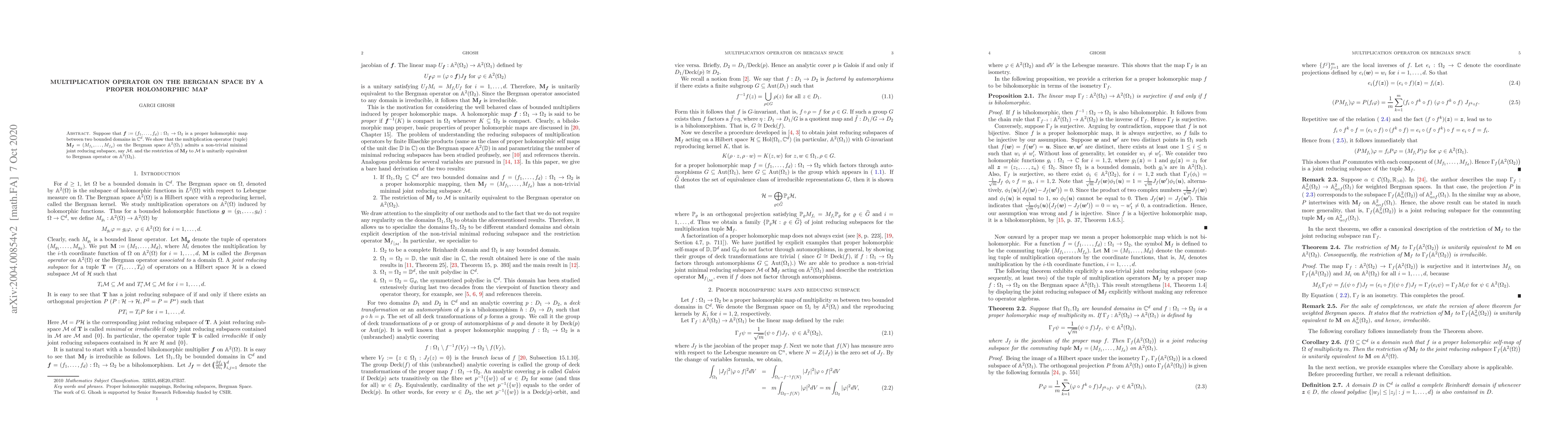 A proper holomorphic map between two bounded domains in C^d has a non-trivial minimal joint reducing subspace for the multiplication operator on the Bergman space, which is unitarily equivalent to the Bergman operator on the target domain.