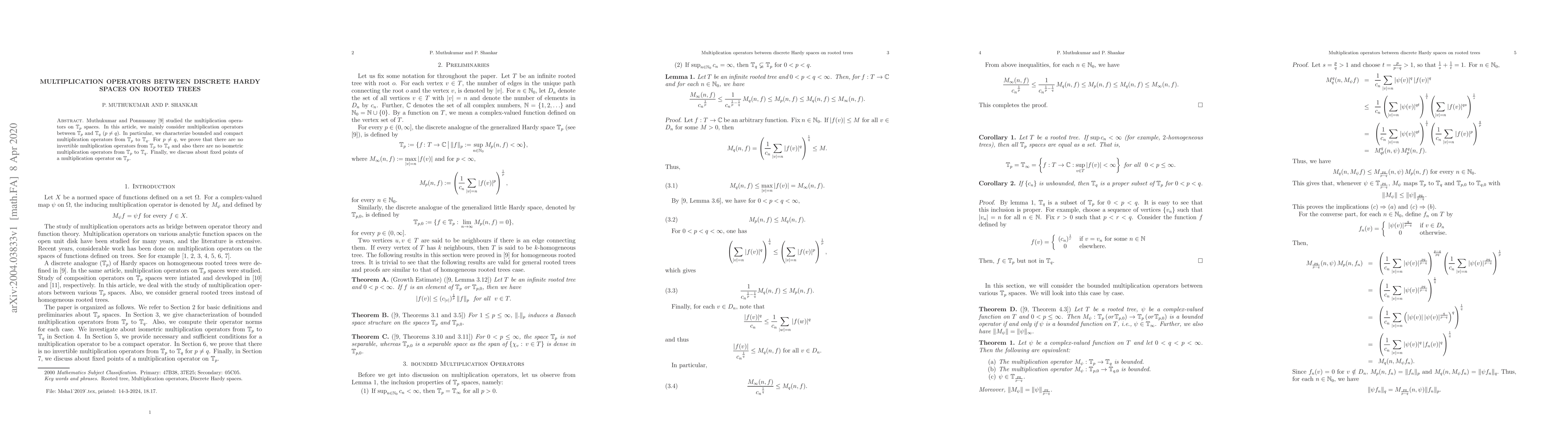 This paper investigates multiplication operators between discrete Hardy spaces $\mathbb{T}_p$ and $\mathbb{T}_q$ on rooted trees, proving that no invertible or isometric operators exist between them when $p \neq q$. It also characterizes bounded and compact operators and discusses fixed points of multiplication operators on $\mathbb{T}_p$.