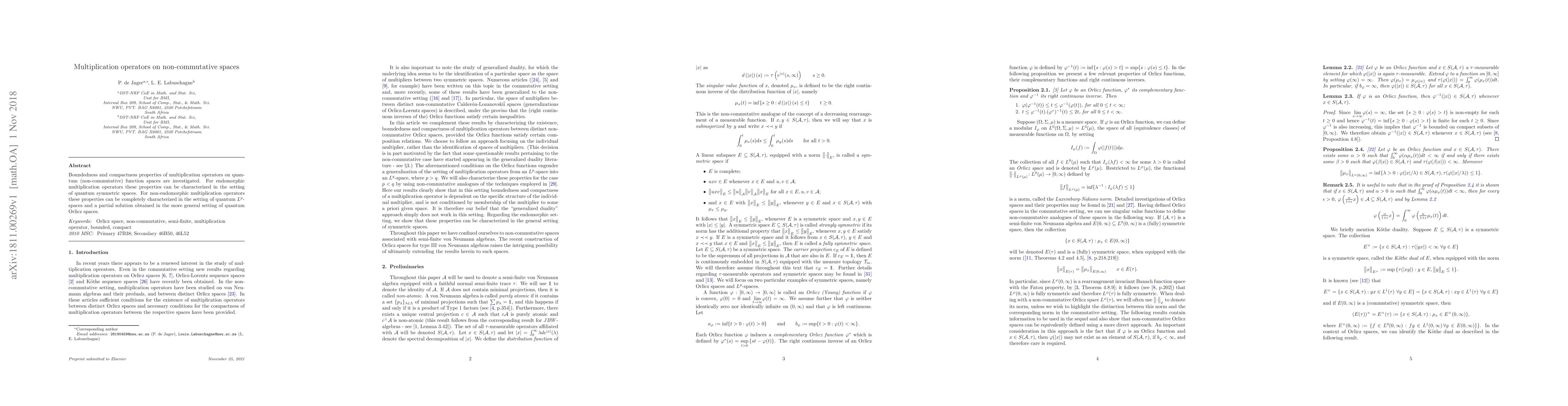 Boundedness and compactness properties of multiplication operators on quantum (non-commutative) function spaces are investigated. For endomorphic multiplication operators these properties can be characterized in the setting of quantum symmetric spaces. For non-endomorphic multiplication operators these properties can be completely characterized in the setting of quantum $L^p$-spaces and a partial solution obtained in the more general setting of quantum Orlicz spaces.