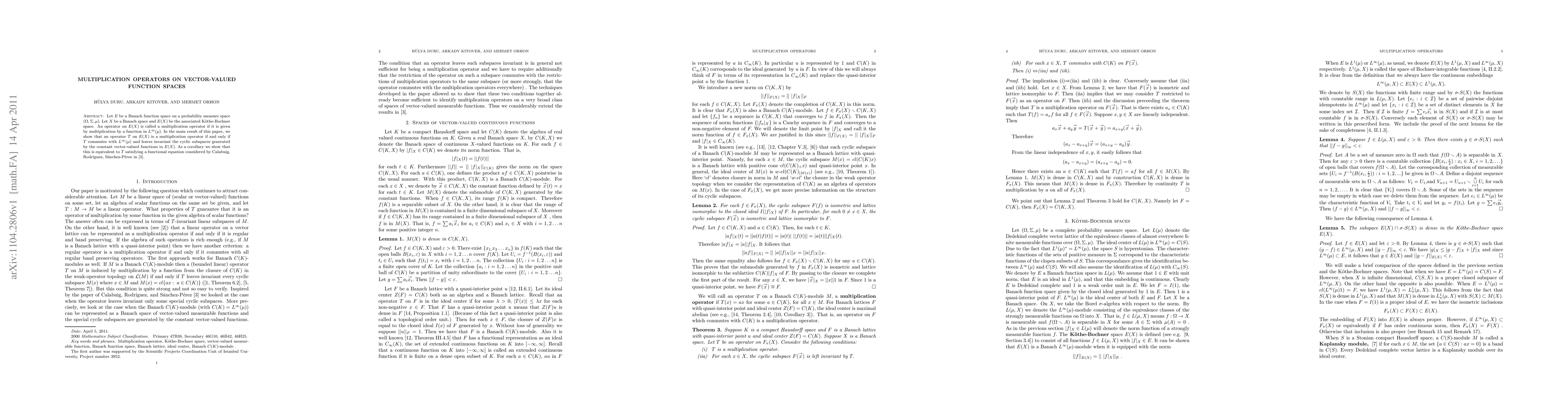 This paper investigates multiplication operators on vector-valued function spaces $E(X)$, proving that an operator $T$ is a multiplication operator if it commutes with $L^{\infty}(\mu)$ and leaves invariant cyclic subspaces generated by constant vector-valued functions in $E(X)$. This is also shown to be equivalent to $T$ satisfying a specific functional equation.