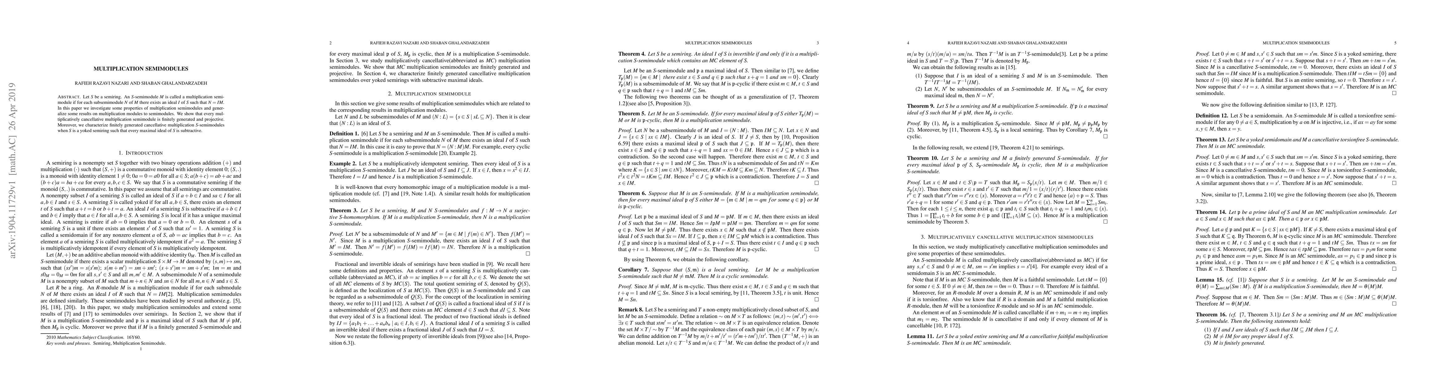 This paper explores multiplication semimodules, a type of $S$-semimodule where each subsemimodule can be expressed as an ideal product. It generalizes properties of multiplication modules to semimodules, proving that certain cancellative multiplication semimodules are finitely generated and projective. Additionally, it characterizes finitely generated cancellative multiplication semimodules under specific conditions on the semiring $S$.